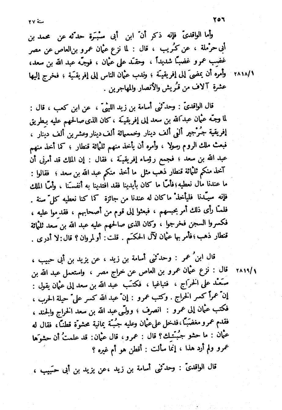 وأما الْوَاقِدِيّ فإنه ذكر أن ابن أبي سبرة حدثه عَنْ مُحَمَّدِ بْنِ أبي حرملة، عن كُرَيْب، قَالَ: لما نزع عُثْمَان عمرو بن الْعَاصِ عن مصر غضب عمرو غضبا شديدا، وحقد عَلَى عُثْمَانَ، فوجه عَبْد اللَّهِ بن سَعْد، وأمره أن يمضي إِلَى إفريقية، وندب عُثْمَان الناس إِلَى إفريقية، فخرج إِلَيْهَا عشرة آلاف من قريش والأنصار والمهاجرين.