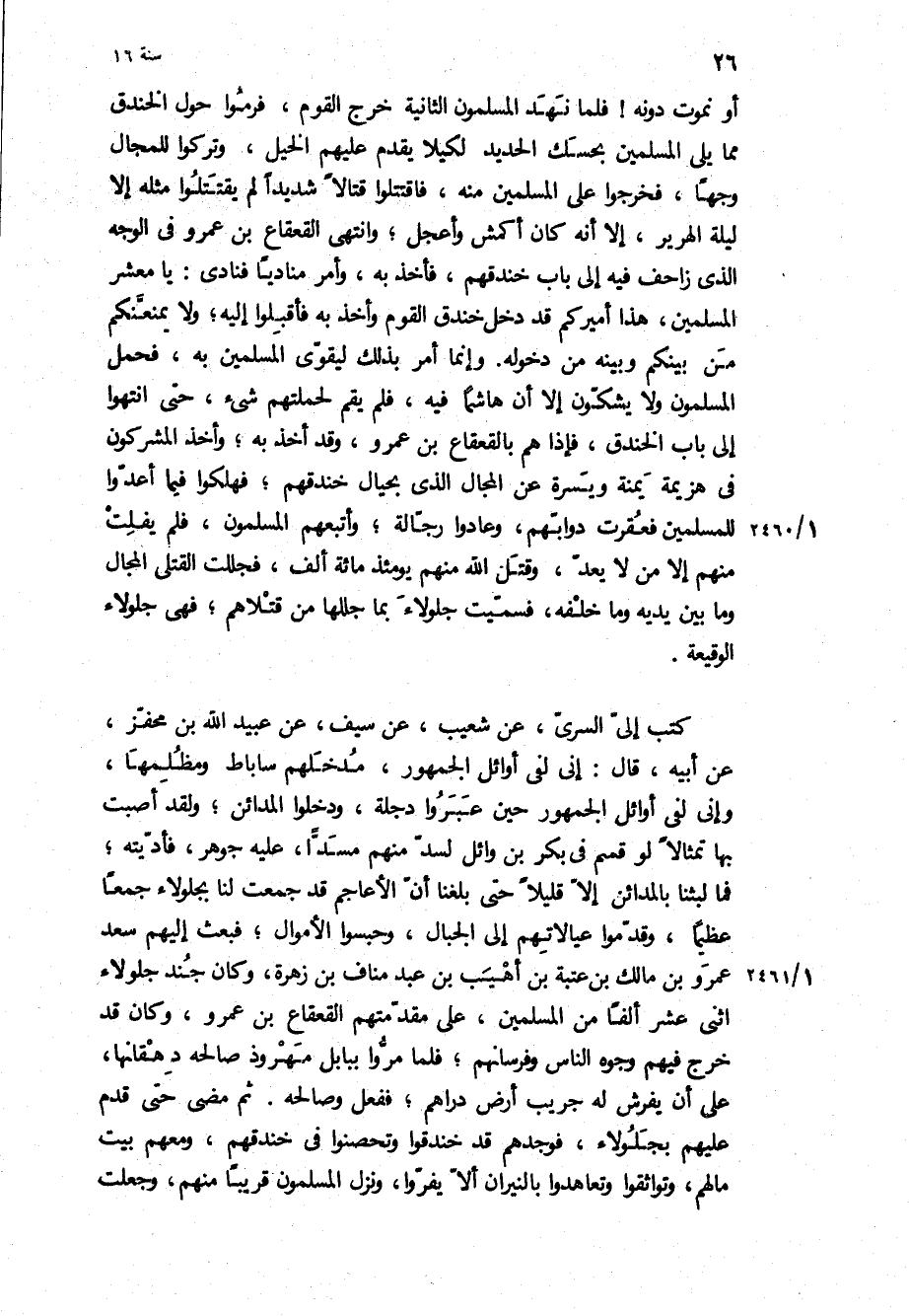 وجها، فخرجوا على المسلمين منه، فاقتتلوا قتالا شديدا لم يقتتلوا مثله إلا ليلة الهرير، إلا أنه كان أكمش وأعجل، وانتهى القعقاع بْن عمرو في الوجه الذي زاحف فيه إلى باب خندقهم، فأخذ به، وأمر مناديا فنادى: يا معشر المسلمين، هذا أميركم قد دخل خندق القوم وأخذ به فأقبلوا إليه، ولا يمنعنكم من بينكم وبينه من دخوله وإنما أمر بذلك ليقوي المسلمين به، فحمل المسلمون ولا يشكون إلا أن هاشما فيه، فلم يقم لحملتهم شيء، حتى انتهوا إلى باب الخندق، فإذا هم بالقعقاع بْن عمرو، وقد أخذ به، وأخذ المشركون في هزيمة يمنة ويسرة عن المجال الذي بحيال خندقهم، فهلكوا فيما أعدوا للمسلمين فعقرت دوابهم، وعادوا رجالة، وأتبعهم المسلمون، فلم يفلت منهم إلا من لا يعد، وقتل اللَّه منهم يومئذ مائة ألف، فجللت القتلى المجال وما بين يديه وما خلفه، فسميت جلولاء بما جللها من قتلاهم، فهي جلولاء الوقيعة كتب إلي السري، عن شعيب، عن سيف، عن عبيد الله بن محفز، عن أبيه، قال: إني لفي أوائل الجمهور، مدخلهم ساباط ومظلمها، وإني لفي أوائل الجمهور حين عبروا دجلة، ودخلوا المدائن، ولقد أصبت بها تمثالا لو قسم في بكر بْن وائل لسد منهم مسدا، عليه جوهر، فأديته، فما لبثنا بالمدائن إلا قليلا حتى بلغنا أن الأعاجم قد جمعت لنا بجلولاء جمعا عظيما، وقدموا عيالاتهم إلى الجبال، وحبسوا الأموال، فبعث إليهم سعد عمرو بْن مالك بْن عتبة بْن أهيب بْن عبد مناف بْن زهرة، وكان جند جلولاء اثني عشر ألفا من المسلمين، على مقدمتهم القعقاع بْن عمرو، وكان قد خرج فيهم وجوه الناس وفرسانهم، فلما مروا ببابل مهروذ صالحه دهقانها، على أن يفرش له جريب أرض دراهم، ففعل وصالحه ثم مضى حتى قدم عليهم بجلولاء، فوجدهم قد خندقوا وتحصنوا في خندقهم، ومعهم بيت ما لهم، وتواثقوا وتعاهدوا بالنيران ألا يفروا، ونزل المسلمون قريبا منهم، وجعلت