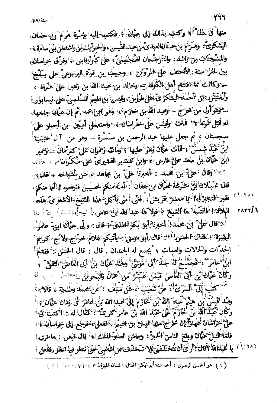 مِنْهَا فِي ذُلٍّ، وَكَتَبَ بِذَلِكَ إِلَى عُثْمَانَ، فَكَتَبَ إِلَيْهِ بِإِمْرَةِ هِرَمِ بْنِ حَسَّانٍ الْيَشْكُرِيِّ، وَهَرَمِ بْنِ حَيَّانَ الْعَبْدِيِّ مِنْ عَبْدِ الْقَيْسِ، والخريت بن راشد من بنى سامه، وَالْمُنْجَابِ بْنِ رَاشِدٍ، وَالتَّرْجُمَانِ الْهُجَيْمِيِّ، عَلَى كُوَرِ فَارِسٍ، وَفَرَّقَ خُرَاسَانَ بَيْنَ نَفَرٍ سِتَّةٍ: الأَحْنَفُ عَلَى الْمُرْوَيْنِ، وَحَبِيبُ بْنُ قُرَّةَ الْيَرْبُوعِيُّ عَلَى بَلْخَ- وَكَانَتْ مِمَّا افْتَتَحَ أَهْلُ الْكُوفَةِ- وَخَالِدُ بْنُ عَبْدِ اللَّهِ بْنِ زُهَيْرٍ عَلَى هَرَاةَ، وَأَمِينُ بْنُ أَحْمَدَ الْيَشْكُرِيُّ عَلَى طُوسٍ، وَقَيْسُ بن الهيثم السُّلَمِيُّ عَلَى نَيْسَابُورَ- وَهُوَ أَوَّلُ مَنْ خَرَجَ- وَعَبْدُ اللَّهِ بْنُ خَازِمٍ، وَهُوَ ابْنُ عَمِّهِ ثُمَّ إِنَّ عُثْمَانَ جَمَعَهَا لَهُ قَبْلَ مَوْتِهِ، فَمَاتَ وَقَيْسٌ عَلَى خُرَاسَانَ، وَاسْتَعْمَلَ أَمِينَ بْنَ أَحْمَرَ عَلَى سِجِسْتَانَ، ثُمَّ جَعَلَ عَلَيْهَا عَبْدَ الرَّحْمَنِ بْنَ سَمُرَةَ- وَهُوَ مِنْ آلِ حَبِيبِ ابن عَبْدِ شَمْسٍ، فَمَاتَ عُثْمَانُ وَهُوَ عَلَيْهَا، وَمَاتَ وعمران على كرمان- وعمير ابن عُثْمَانَ بْنِ سَعْدٍ عَلَى فَارِسٍ، وَابْنُ كُنْدِيرٍ الْقُشَيْرِيُّ عَلَى مُكْرَانَ.