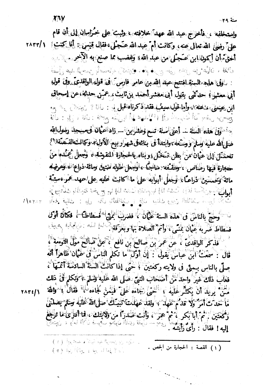 فَذَكَرَ الْوَاقِدِيُّ، عَنْ عُمَرَ بْنِ صَالِحِ بْنِ نَافِعٍ، عَنْ صَالِحٍ مَوْلَى التَّوْءَمَةَ، قَالَ: سَمِعْتُ ابْنَ عَبَّاسٍ يَقُولُ: إِنَّ أَوَّلَ مَا تَكَلَّمَ النَّاسُ فِي عُثْمَانَ ظَاهِرًا أَنَّهُ صَلَّى بِالنَّاسِ بِمِنًى فِي وِلايَتِهِ رَكْعَتَيْنِ، حَتَّى إِذَا كَانَتِ السَّنَةُ السَّادِسَةُ أَتَمَّهَا، فَعَابَ ذلك غير واحد من اصحاب النبي ص، وَتَكَلَّمَ فِي ذَلِكَ مَنْ يُرِيدُ أَنْ يُكْثِرَ عَلَيْهِ، [حَتَّى جَاءَهُ عَلِيٌّ فِيمَنْ جَاءَهُ، فَقَالَ: وَاللَّهِ مَا حَدَثَ أَمْرٌ وَلا قَدِمَ عَهْدٌ، ولقد عهدت نبيك ص يُصَلِّي رَكْعَتَيْنِ ثُمَّ أَبَا بَكْرٍ، ثُمَّ عُمَرَ، وَأَنْتَ صَدْرًا مِنْ وِلايَتِكَ، فَمَا أَدْرِي مَا تَرْجِعُ إِلَيْهِ!] فَقَالَ: رَأْيٌ رَأَيْتُهُ