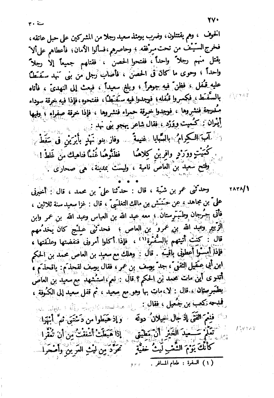 وَحَدَّثَنِي عُمَرُ بْنُ شَبَّةَ، قَالَ: حَدَّثَنَا عَلِيُّ بْنُ مُحَمَّدٍ، قَالَ: أَخْبَرَنِي عَلِيُّ بْنُ مُجَاهِدٍ، عَنْ حَنَشِ بْنِ مَالِكٍ التَّغْلِبِيِّ، قَالَ: غَزَا سَعِيدٌ سَنَةَ ثَلاثِينَ، فَأَتَى جُرْجَانَ وَطَبَرِسْتَانَ، مَعَهُ عَبْدُ اللَّهِ بْنُ الْعَبَّاسِ وَعَبْدُ اللَّهِ بْنُ عُمَرَ وَابْنُ الزُّبَيْرِ وَعَبْدُ اللَّهِ بْنُ عَمْرِو بْنِ الْعَاصِ، فَحَدَّثَنِي عِلْجٌ كَانَ يَخْدُمُهُمْ قال: كنت أتيتهم بِالسُّفْرَةِ، فَإِذَا أَكَلُوا أَمَرُونِي فَنَفَضْتُهَا وَعَلَّقْتُهَا، فَإِذَا أَمْسَوْا أَعْطُونِي بَاقِيَةً قَالَ: وَهَلَكَ مَعَ سَعِيدِ بن العاص محمد بن الحكم ابن أَبِي عَقِيلٍ الثَّقَفِيُّ، جَدُّ يُوسُفَ بْنِ عُمَرَ، فَقَالَ يُوسُفُ لِقَحْذَمٍ: يَا قَحْذَمُ، أَتَدْرِي أَيْنَ مَاتَ مُحَمَّدُ بْنُ الْحَكَمِ؟ قَالَ: نَعَمْ، اسْتُشْهِدَ مَعَ سَعِيدِ بْنِ الْعَاصِ بِطَبَرِسْتَانَ، قَالَ: لا، مَاتَ بِهَا وَهُوَ مَعَ سَعِيدٍ، ثُمَّ قَفَلَ سَعِيدٌ إِلَى الْكُوفَةِ، فَمَدَحَهُ كَعْبُ بْنُ جُعَيْلٍ، فَقَالَ: