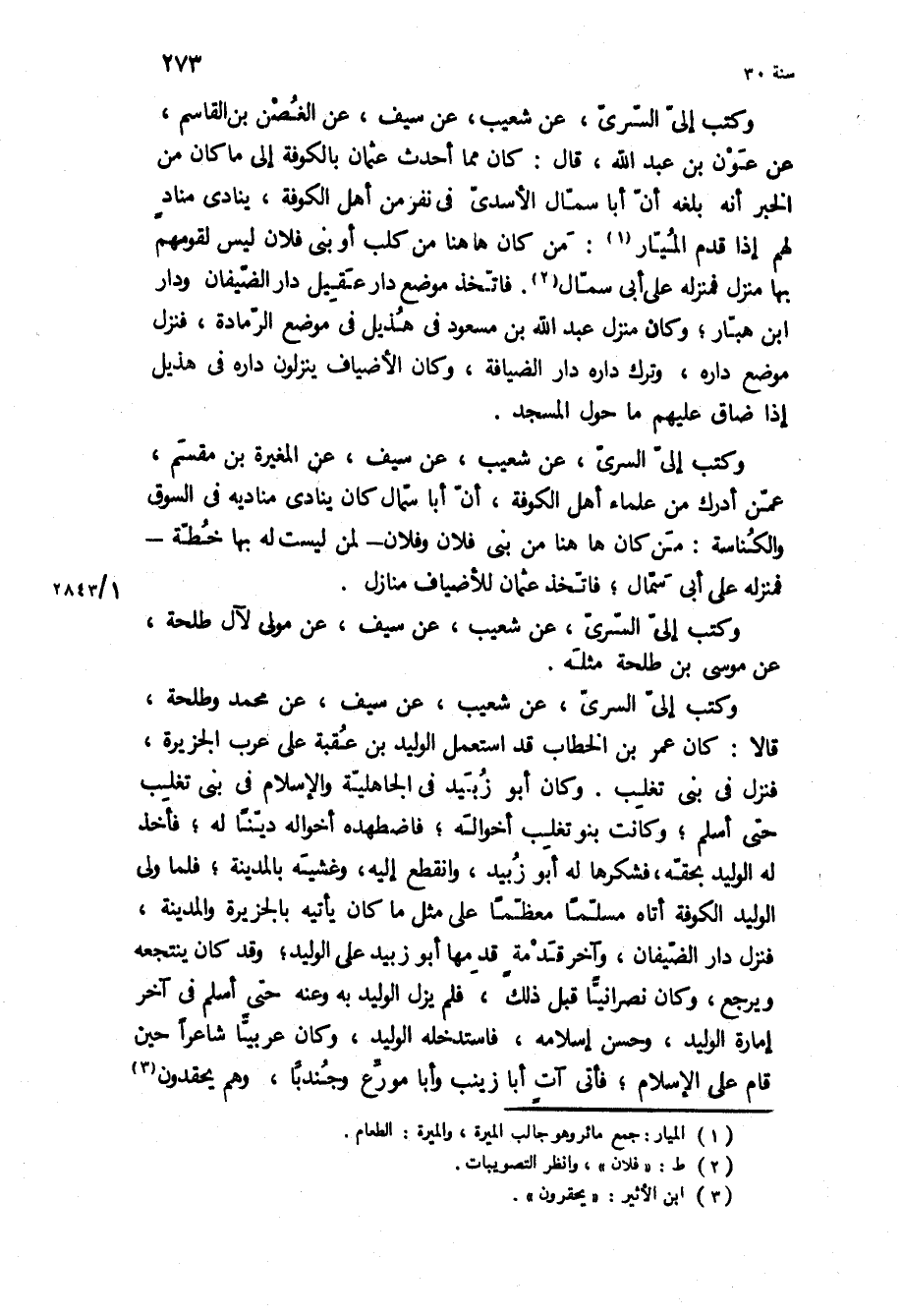 وكتب إلي السري، عن شعيب، عن سيف، عن الغصن بن الْقَاسِم، عن عون بن عَبْدِ اللَّهِ، قَالَ: كَانَ مما أحدث عُثْمَان بالكوفة إِلَى مَا كَانَ من الخبر أنه بلغه أن أبا سمال الأسدي فِي نفر من أهل الْكُوفَة، ينادي مناد لَهُمْ إذا قدم الميار: من كان هاهنا من كلب أو بني فلان ليس لقومهم بها منزل فمنزله على ابى سمال فاتخذ موضع دار عقيل دار الضيفان ودار ابن هبار، وَكَانَ منزل عَبْد اللَّهِ بن مسعود فِي هذيل فِي موضع الرمادة، فنزل موضع داره، وترك داره دار الضيافة، وَكَانَ الأضياف ينزلون داره فِي هذيل إذا ضاق عَلَيْهِم مَا حول المسجد وَكَتَبَ إِلَيَّ السَّرِيُّ، عَنْ شُعَيْبٍ، عَنْ سَيْفٍ، عن الْمُغِيرَة بن مقسم، عمن أدرك من علماء أهل الْكُوفَة، إن أبا سمال كَانَ ينادي مناديه فِي السوق والكناسة: من كان هاهنا من بني فلان وفلان- لمن ليست لَهُ بِهَا خطة- فمنزله عَلَى أبي سمال، فاتخذ عُثْمَان للأضياف منازل.