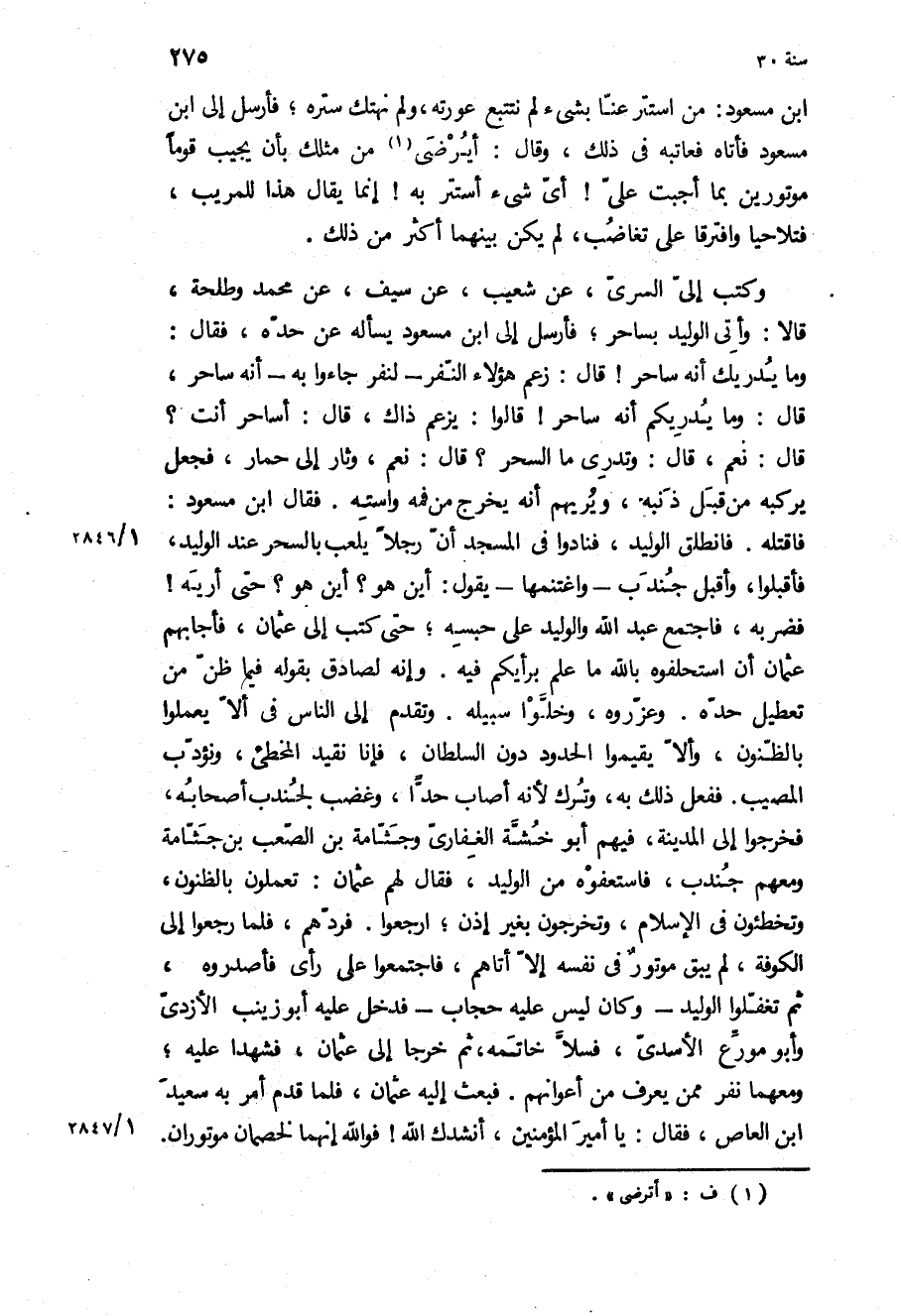فَاقْتُلْهُ فَانْطَلَقَ الْوَلِيدُ، فَنَادَوْا فِي الْمَسْجِدِ أَنَّ رَجُلا يَلْعَبُ بِالسِّحْرِ عِنْدَ الْوَلِيدِ، فَأَقْبَلُوا، وَأَقْبَلَ جُنْدُبٌ- وَاغْتَنَمَهَا- يَقُولُ: أَيْنَ هُوَ؟ أَيْنَ هُوَ؟ حَتَّى أُرِيَهُ! فَضَرَبَهُ، فَاجْتَمَعَ عَبْدُ اللَّهِ وَالْوَلِيدُ عَلَى حَبْسِهِ، حَتَّى كَتَبَ إِلَى عُثْمَانَ، فَأَجَابَهُمْ عُثْمَانُ أَنِ اسْتَحْلِفُوهُ بِاللَّهِ مَا عَلِمَ بِرَأْيِكُمْ فِيهِ وَإِنَّهُ لَصَادِقٌ بِقَوْلِهِ فِيمَا ظَنَّ مِنْ تَعْطِيلِ حَدِّهِ وَعَزِّرُوهُ، وَخَلُّوا سَبِيلَهُ وَتَقَدَّمْ إِلَى النَّاسِ فِي أَلا يَعْمَلُوا بِالظُّنُونِ، وَأَلا يُقِيمُوا الْحُدُودَ دُونَ السُّلْطَانِ، فَإِنَّا نُقَيِّدُ الْمُخْطِئَ، وَنُؤَدِّبُ الْمُصِيبَ فَفَعَلَ ذَلِكَ بِهِ، وَتُرِكَ لأَنَّهُ أَصَابَ حَدًّا، وَغَضِبَ لِجُنْدُبٍ أَصْحَابُهُ، فَخَرَجُوا إِلَى الْمَدِينَةِ، فِيهِمْ أَبُو خُشَّةَ الْغِفَارِيُّ وَجَثَّامَةُ بْنُ الصَّعْبِ بْنِ جَثَّامَةَ وَمَعَهُمْ جُنْدُبٌ، فَاسْتَعْفَوْهُ مِنَ الْوَلِيدِ، فَقَالَ لَهُمْ عُثْمَانُ: تَعْمَلُونَ بِالظُّنُونِ، وَتُخْطِئُونَ فِي الإِسْلامِ، وَتَخْرُجُونَ بِغَيْرِ إِذْنٍ، ارْجِعُوا فَرَدَّهُمْ، فَلَمَّا رَجَعُوا إِلَى الْكُوفَةِ، لَمْ يَبْقَ مَوْتُورٌ فِي نَفْسِهِ إِلا أَتَاهُمْ، فَاجْتَمَعُوا عَلَى رَأْيٍ فَأَصْدَرُوهُ، ثُمَّ تَغَفَّلُوا الْوَلِيدَ- وَكَانَ لَيْسَ عَلَيْهِ حِجَابٌ- فَدَخَلَ عَلَيْهِ أَبُو زَيْنَبَ الأَزْدِيُّ وَأَبُو مُوَرِّعٍ الأَسَدِيُّ، فَسَلا خَاتَمَهُ، ثُمَّ خَرَجَا إِلَى عُثْمَانَ، فَشَهِدَا عَلَيْهِ، وَمَعَهُمَا نَفَرٌ مِمَّنْ يُعْرَفُ مِنْ أَعْوَانِهِمْ فَبَعَثَ إِلَيْهِ عُثْمَانُ، فَلَمَّا قَدِمَ أَمَرَ به سعيد ابن الْعَاصِ، فَقَالَ: يَا أَمِيرَ الْمُؤْمِنِينَ، أَنْشُدُكَ اللَّهَ! فو الله إِنَّهُمَا لَخَصْمَانِ مَوْتُورَانِ