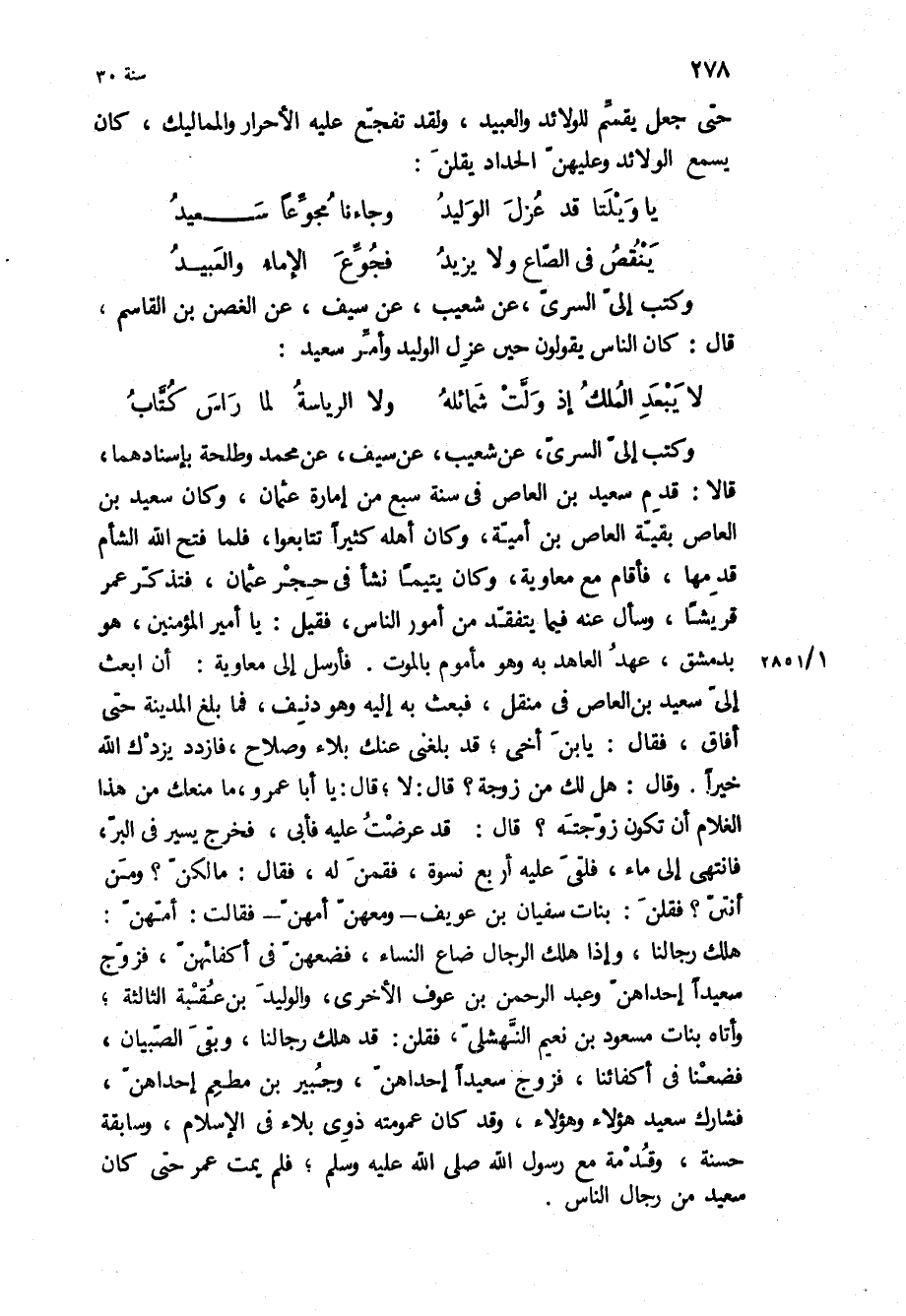 وكتب إلي السري، عن شعيب، عن سيف، عَنْ مُحَمَّدٍ وَطَلْحَةَ بِإِسْنَادِهِمَا، قَالا: قَدِم سَعِيدُ بْنُ الْعَاصِ فِي سَنَةَ سَبْعٍ مِنْ إِمَارَةِ عُثْمَانَ، وَكَانَ سَعِيدُ بْنُ الْعَاصِ بَقِيَّةَ الْعَاصِ بْنِ أُمَيَّةَ، وَكَانَ أَهْلُهُ كَثِيرًا تَتَابَعُوا، فَلَمَّا فَتَحَ اللَّهُ الشَّامَ قَدِمَهَا، فَأَقَامَ مَعَ مُعَاوِيَةَ، وَكَانَ يَتِيمًا نَشَأَ فِي حِجْرِ عُثْمَانَ، فَتَذَكَّرَ عُمَرُ قُرَيْشًا، وَسَأَلَ عَنْهُ فِيمَا يَتَفَقَّدُ مِنْ أُمُورِ النَّاسِ، فَقِيلَ: يَا أَمِيرَ الْمُؤْمِنِينَ، هُوَ بِدِمَشْقَ، عَهِدَ الْعَاهِدُ بِهِ وَهُوَ مَأْمُومٌ بِالْمَوْتِ فأرسل الى معاويه: ان ابعث لي سَعِيدَ بْنَ الْعَاصِ فِي مَنْقِلٍ، فَبَعَثَ بِهِ إِلَيْهِ وَهُوَ دَنِفٌ، فَمَا بَلَغَ الْمَدِينَةَ حَتَّى افاق، فقال: يا بن أَخِي، قَدْ بَلَغَنِي عَنْكَ بَلاءٌ وَصَلاحٌ، فَازْدَدْ يَزِدْكَ اللَّهُ خَيْرًا وَقَالَ: هَلْ لَكَ مِنْ زَوْجَةٍ؟ قَالَ: لا، قَالَ: يَا أَبَا عَمْرٍو، مَا مَنَعَكَ مِنْ هَذَا الْغُلامِ أَنْ تَكُونَ زَوَّجْتَهُ؟ قَالَ: قَدْ عَرَضْتُ عَلَيْهِ فَأَبَى، فَخَرَجَ يَسِيرُ فِي الْبَرِّ، فَانْتَهَى إِلَى مَاءٍ، فَلَقِيَ عَلَيْهِ أَرْبَعَ نِسْوَةٍ، فَقُمْنَ لَهُ، فَقَالَ: مَا لَكُنَّ؟ وَمَنْ أَنْتُنَّ؟ فَقُلْنَ: بَنَاتُ سُفْيَانَ بْنِ عُوَيْفٍ- وَمَعَهُنَّ أُمُّهُنَّ- فَقَالَتْ: أُمُّهُنَّ: