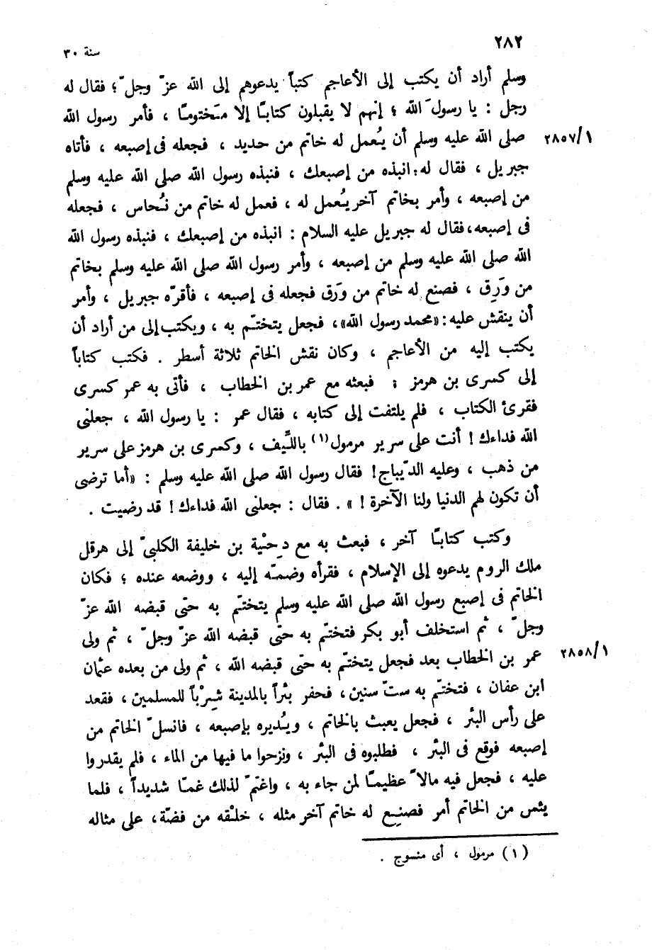 وَكَتَبَ كِتَابًا آخَرَ، فَبَعَثَ بِهِ مَعَ دَحْيَةَ بْنِ خَلِيفَةَ الْكَلْبِيِّ إِلَى هِرَقْلَ مَلِكِ الرُّومِ يَدْعُوهُ إِلَى الإِسْلامِ، فَقَرَأَهُ وَضَمَّهُ إِلَيْهِ، وَوَضَعَهُ عِنْدَهُ، فَكَانَ الْخَاتَمُ فِي أُصْبُعِ رَسُولِ اللَّهِ ص يَتَخَتَّمُ بِهِ حَتَّى قَبَضَهُ اللَّهُ عَزَّ وَجَلَّ، ثُمَّ اسْتُخْلِفَ أَبُو بَكْرٍ فَتَخَتَّمَ بِهِ حَتَّى قَبَضَهُ اللَّهُ عَزَّ وَجَلَّ، ثُمَّ وُلِّيَ عُمَرُ بْنُ الْخَطَّابِ بَعْدُ فَجَعَلَ يَتَخَتَّمُ بِهِ حَتَّى قَبَضَهُ اللَّهُ، ثُمَّ وُلِّيَ مِنْ بَعْدِهِ عُثْمَانُ ابن عَفَّانَ، فَتَخَتَّمَ بِهِ سِتَّ سِنِينَ، فَحَفَرَ بِئْرًا بِالْمَدِينَةِ شُرْبًا لِلْمُسْلِمِينَ، فَقَعَدَ عَلَى رَأْسِ الْبِئْرِ، فَجَعَلَ يَعْبَثُ بِالْخَاتَمِ، وَيُدِيرُهُ بِأُصْبُعِهِ، فَانْسَلَّ الْخَاتَمُ مِنْ أُصْبُعِهِ فَوَقَعَ فِي الْبِئْرِ، فَطَلَبُوهُ فِي الْبِئْرِ، وَنَزَحُوا مَا فِيهَا مِنَ الْمَاءِ، فَلَمْ يَقْدِرُوا عَلَيْهِ، فَجَعَلَ فِيهِ مَالا عَظِيمًا لِمَنْ جَاءَ بِهِ، وَاغْتَمَّ لِذَلِكَ غَمًّا شَدِيدًا، فَلَمَّا يَئِسَ مِنَ الْخَاتَمِ أَمَرَ فَصُنِعَ لَهُ خَاتَمٌ آخر مثله، خلقه مِنْ فِضَّةٍ، عَلَى مِثَالِهِ