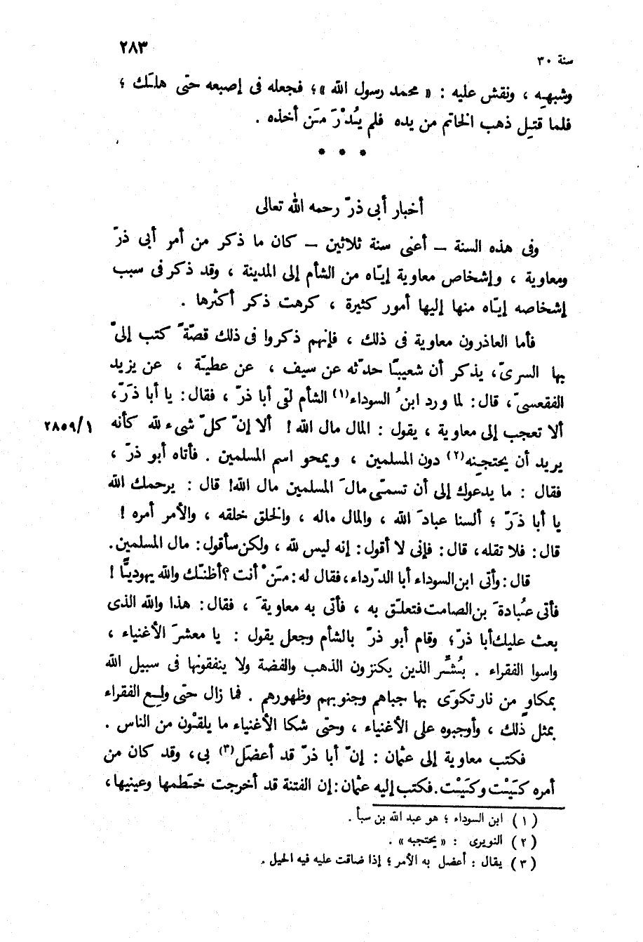 وفي هَذِهِ السنة- أعني سنة ثَلاثِينَ- كَانَ مَا ذكر من أمر أبي ذر ومعاوية، وإشخاص مُعَاوِيَة إِيَّاهُ من الشام إِلَى الْمَدِينَةِ، وَقَدْ ذكر فِي سبب إشخاصه إِيَّاهُ منها إِلَيْهَا أمور كثيرة، كرهت ذكر أكثرها.