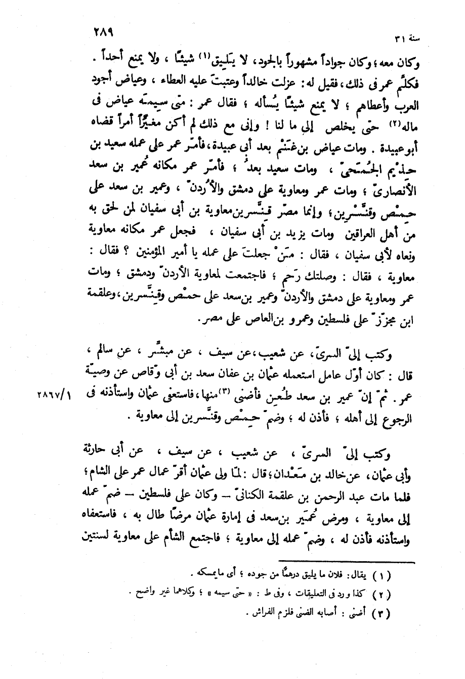 فَكُلِّمَ عُمَرُ فِي ذَلِكَ، فَقِيلَ لَهُ: عَزَلْتَ خَالِدًا وَعَتَبْتَ عَلَيْهِ الْعَطَاءَ، وَعِيَاضٌ أَجْوَدُ الْعَرَبِ وَأَعْطَاهُمْ، لا يَمْنَعُ شَيْئًا يُسْأَلُهُ، فَقَالَ عُمَرُ: مَتَى سيمه عياض في ماله حتى يخلص الى ما لنا! وَإِنِّي مَعَ ذَلِكَ لَمْ أَكُنْ مُغَيِّرًا أَمْرًا قَضَاهُ أَبُو عُبَيْدَةَ وَمَاتَ عِيَاضُ بْنُ غَنْمٍ بَعْدَ أَبِي عُبَيْدَةَ، فَأَمَّرَ عُمَرُ عَلَى عَمَلِهِ سَعِيدَ بْنَ حُذَيْمٍ الْجُمَحِيَّ، وَمَاتَ سَعِيدٌ بَعْدُ، فَأَمَّرَ عُمَرُ مَكَانَهُ عُمَيْرَ بْنَ سَعْدٍ الأَنْصَارِيَّ، وَمَاتَ عُمَرُ وَمُعَاوِيَةُ عَلَى دِمَشْقَ وَالأُرْدُنِّ، وَعُمَيْرُ بْنُ سَعْدٍ عَلَى حِمْصَ وَقِنَّسْرِينَ، وَإِنَّمَا مَصَّرَ قِنَّسْرِينَ مُعَاوِيَةُ بْنُ أَبِي سُفْيَانَ لِمَنْ لَحِقَ بِهِ مِنْ أَهْلِ الْعِرَاقَيْنِ وَمَاتَ يَزِيدُ بْنُ أَبِي سُفْيَانَ، فَجَعَلَ عُمَرُ مَكَانَهُ مُعَاوِيَةَ وَنَعَاهُ لأَبِي سُفْيَانَ، فَقَالَ: مَنْ جَعَلْتَ عَلَى عَمَلِهِ يَا أَمِيرَ الْمُؤْمِنِينَ؟ فَقَالَ: