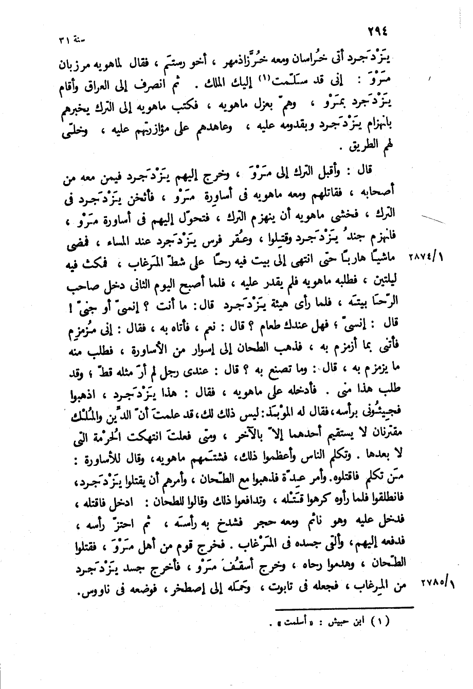 قَالَ: وأقبل الترك إِلَى مرو، وخرج إِلَيْهِم يزدجرد فيمن مَعَهُ من أَصْحَابه، فقاتلهم وَمَعَهُ مَاهويه فِي أساورة مرو، فأثخن يزدجرد فِي الترك، فخشي ماهويه أن ينهزم الترك، فتحول إِلَيْهِم فِي أساورة مرو، فانهزم جند يزدجرد وقتلوا، وعقر فرس يزدجرد عِنْدَ المساء، فمضى ماشيا هاربا حَتَّى انتهى إِلَى بيت فِيهِ رحا عَلَى شط المرغاب، فمكث فِيهِ ليلتين، فطلبه ماهويه فلم يقدر عَلَيْهِ، فلما أصبح اليوم الثانى دخل صاحب الرحا بيته، فلما رَأَى هيئة يزدجرد قَالَ: مَا أنت؟ إنسي أو جني! قَالَ: إنسي، فهل عندك طعام؟ قَالَ: نعم، فأتاه بِهِ، فَقَالَ: إني مزمزم فأتني بِمَا أزمزم بِهِ، فذهب الطحان إِلَى إسوار من الأساورة، فطلب مِنْهُ مَا يزمزم بِهِ، قَالَ: وما تصنع بِهِ؟ قَالَ: عندي رجل لم أر مثله قط، وَقَدْ طلب هَذَا مني فأدخله عَلَى ماهويه، فَقَالَ: هَذَا يزدجرد، اذهبوا فجيئوني برأسه، فَقَالَ لَهُ الموبذ: ليس ذَلِكَ لك، قَدْ علمت أن الدين والملك مقترنان لا يستقيم أحدهما إلا بالآخر، ومتى فعلت انتهكت الحرمة الَّتِي لا بعدها وتكلم الناس وأعظموا ذَلِكَ، فشتمهم ماهويه، وَقَالَ للأساورة: