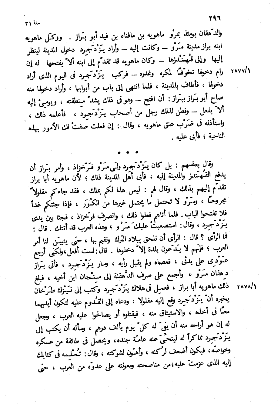 فما الرأي؟ قَالَ: الرأي أن نلحق ببلاد الترك ونقيم بِهَا، حَتَّى يتبين لنا أمر العرب، فإنهم لا يدعون بلدة إلا دخلوها قَالَ: لست أفعل، ولكنى أرجع عودي عَلَى بدئي، فعصاه ولم يقبل رأيه، وسار يزدجرد، فأتى براز دهقان مرو، وأجمع عَلَى صرف الدهقنة إِلَى سنجان ابن أخيه، فبلغ ذَلِكَ ماهوية أبا براز، فعمل فِي هلاك يزدجرد وكتب إِلَى نيزك طرخان يخبره أن يزدجرد وقع إِلَيْهِ مفلولا، ودعاه إِلَى القدوم عَلَيْهِ لتكون أيديهما معا فِي أخذه، والاستيثاق مِنْهُ، فيقتلوه أو يصالحوا عَلَيْهِ العرب، وجعل لَهُ إن هُوَ أراحه مِنْهُ أن يفي لَهُ كل يوم بألف درهم، وسأله أن يكتب إِلَى يزدجرد مماكرا لَهُ لينحي عنه عامة جنده، ويحصل فِي طائفة من عسكره وخواصه، فيكون أضعف لركنه، وأهون لشوكته، وَقَالَ: تعلمه فِي كتابك إِلَيْهِ الَّذِي عزمت عَلَيْهِ، من مناصحته ومعونته عَلَى عدوه من العرب، حتى