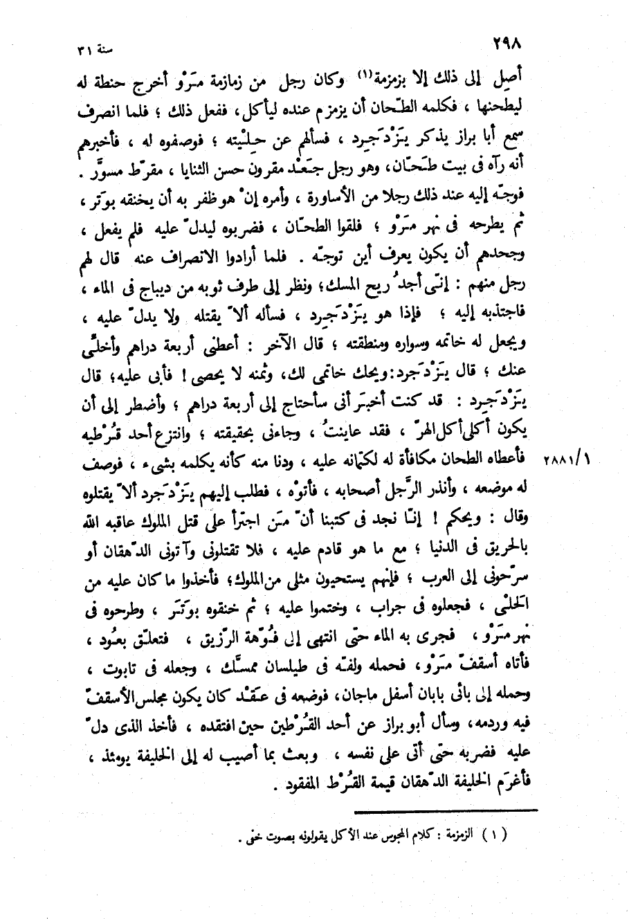 أصل إِلَى ذَلِكَ إلا بزمزمة وَكَانَ رجل من زمازمة مرو أخرج حنطة لَهُ ليطحنها، فكلمه الطحان أن يزمزم عنده ليأكل، ففعل ذَلِكَ، فلما انصرف سمع أبا براز يذكر يزدجرد، فسألهم عن حليته، فوصفوه لَهُ، فأخبرهم أنه رآه فِي بيت طحان، وَهُوَ رجل جعد مقرون حسن الثنايا، مقرط مسور.