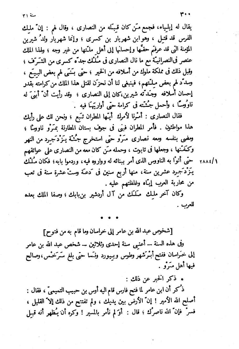 وفي هَذِهِ السنة- أعني سنة إحدى وثلاثين- شخص عَبْد اللَّهِ بن عَامِر إِلَى خُرَاسَان ففتح ابرشهر وطوس وبيورد ونسا حَتَّى بلغ سرخس، وصالح فِيهَا أهل مرو.
