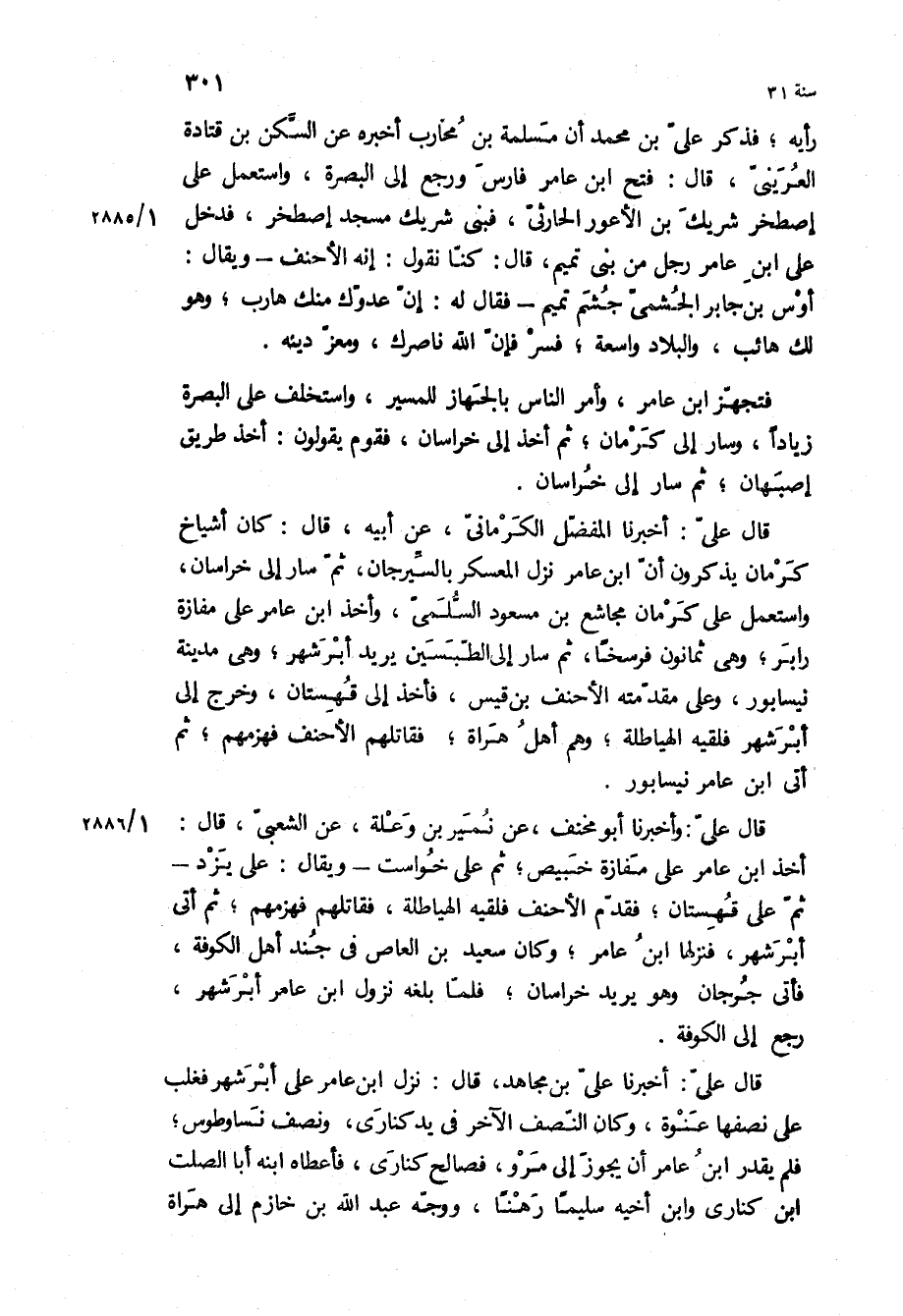 قَالَ علي: أَخْبَرَنَا المفضل الكرماني، عَنْ أَبِيهِ، قَالَ: كَانَ أشياخ كَرْمَان يذكرون أن ابن عَامِر نزل المعسكر بالسيرجان، ثُمَّ سار إِلَى خُرَاسَان، وَاسْتَعْمَلَ عَلَى كَرْمَان مجاشع بن مسعود السلمى، وأخذ ابن عامر على مفازة رابر، وَهِيَ ثمانون فرسخا، ثُمَّ سار إِلَى الطبسين يريد أَبْرَشَهْر، وَهِيَ مدينة نيسابور، وعلى مقدمته الأحنف بن قيس، فأخذ إِلَى قهستان، وخرج إِلَى أَبْرَشَهْر فلقيه الهياطلة، وهم أهل هراة، فقاتلهم الأحنف فهزمهم، ثُمَّ أتى ابن عَامِر نيسابور قَالَ علي: وأخبرنا أَبُو مخنف، عن نمير بن وعلة، عَنِ الشَّعْبِيِّ، قَالَ: