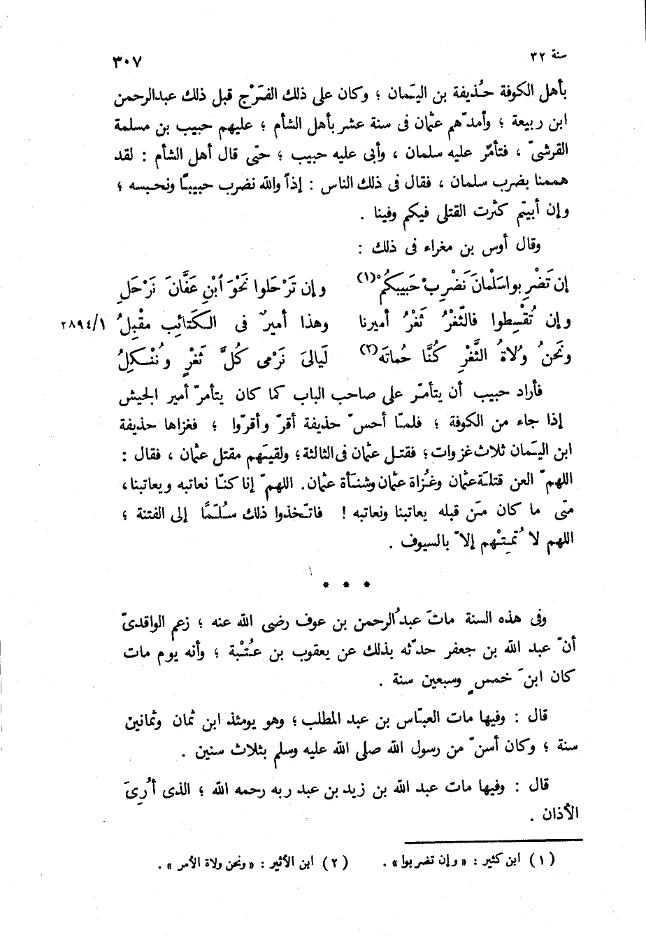 اللَّهُمَّ العن قتلة عُثْمَان وغزاة عُثْمَان وشناة عُثْمَان اللَّهُمَّ إنا كنا نعاتبه ويعاتبنا، متى مَا كَانَ من قبله يعاتبنا ونعاتبه! فاتخذوا ذَلِكَ سلما إِلَى الفتنة، اللَّهُمَّ لا تمتهم إلا بالسيوف وفي هَذِهِ السنة مات عبد الرَّحْمَن بن عوف رَضِيَ اللَّهُ عَنْهُ، زعم الْوَاقِدِيّ أن عَبْد اللَّهِ بن جَعْفَر حدثه بِذَلِكَ عن يَعْقُوب بن عتبة، وأنه يوم مات كَانَ ابن خمس وسبعين سنة.