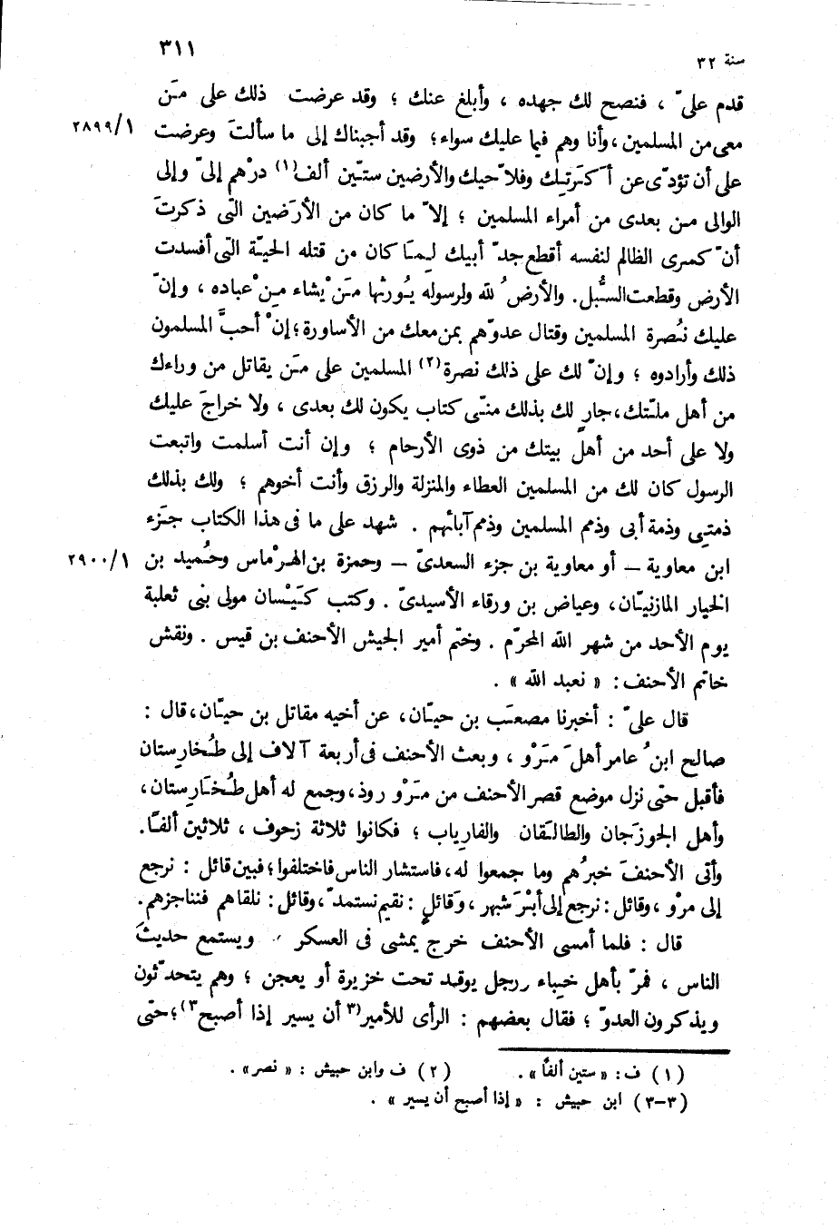 قدم علي، فنصح لك جهده، وأبلغ عنك، وَقَدْ عرضت ذَلِكَ عَلَى من معي مِنَ الْمُسْلِمِينَ، وأنا وهم فِيمَا عَلَيْك سواء، وَقَدْ أجبناك إِلَى مَا سألت وعرضت عَلَى أن تؤدي عن أكرتك وفلاحيك والأرضين ستين ألف درهم إلي وإلى الوالي من بعدي من أمراء الْمُسْلِمِينَ، إلا مَا كَانَ من الأرضين الَّتِي ذكرت أن كسرى الظالم لنفسه أقطع جد أبيك لما كَانَ من قتله الحية الَّتِي أفسدت الأرض وقطعت السبل والأرض لِلَّهِ ولرسوله يُورِثُها مَنْ يَشاءُ مِنْ عِبادِهِ، وإن عَلَيْك نصرة الْمُسْلِمِينَ وقتال عدوهم بمن معك من الأساورة، إن أحب الْمُسْلِمُونَ ذَلِكَ وأرادوه، وإن لك عَلَى ذَلِكَ نصرة الْمُسْلِمِينَ عَلَى من يقاتل من وراءك من أهل ملتك، جار لك بِذَلِكَ مني كتاب يكون لك بعدي، وَلا خراج عَلَيْك وَلا عَلَى أحد من أهل بيتك من ذوي الأرحام، وإن أنت أسلمت واتبعت الرسول كَانَ لك مِنَ الْمُسْلِمِينَ العطاء والمنزلة والرزق وأنت أخوهم، ولك بِذَلِكَ ذمتي وذمة أبي وذمم الْمُسْلِمِينَ وذمم آبائهم شهد عَلَى مَا فِي هَذَا الكتاب جزء ابن مُعَاوِيَة- أو مُعَاوِيَة بن جزء السعدي- وحمزة بن الهرماس وحميد بن الخيار المازنيان، وعياض بن ورقاء الأسيدي وكتب كيسان مولى بني ثعلبة يوم الأحد من شهر اللَّه المحرم وختم أَمِير الجيش الأحنف بن قيس ونقش خاتم الأحنف: نعبد اللَّه.
