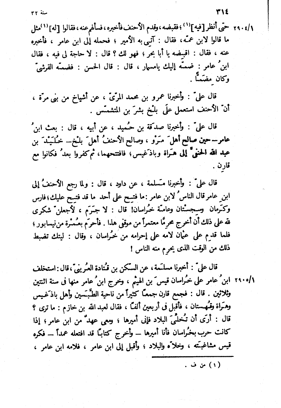 قَالَ على: وأخبرنا مسلمه، عن داود، قال: ولما رجع الأحنف إِلَى ابن عَامِر قَالَ الناس لابن عَامِر: مَا فتح عَلَى أحد مَا قَدْ فتح عَلَيْك، فارس وكرمان وسجستان وعامة خُرَاسَان! قَالَ: لا جرم، لأجعلن شكري لِلَّهِ عَلَى ذَلِكَ أن أخرج محرما معتمرا من موقفي هَذَا فأحرم بعمرة من نيسابور، فلما قدم عَلَى عُثْمَانَ لامه عَلَى إحرامه من خُرَاسَان، وَقَالَ: ليتك تضبط ذَلِكَ من الوقت الَّذِي يحرم مِنْهُ الناس! قَالَ علي: أَخْبَرَنَا مسلمة، عن السكن بن قَتَادَة العريني، قَالَ: استخلف ابن عَامِر عَلَى خُرَاسَان قيس بن الهيثم، وخرج ابن عَامِر منها فِي سنة اثنتين وثلاثين قَالَ: فجمع قارن جمعا كثيرا من ناحية الطبسين وأهل باذغيس وهراة وقهستان، فأقبل فِي أربعين ألفا، فَقَالَ لعبد اللَّه بن خازم: مَا ترى؟