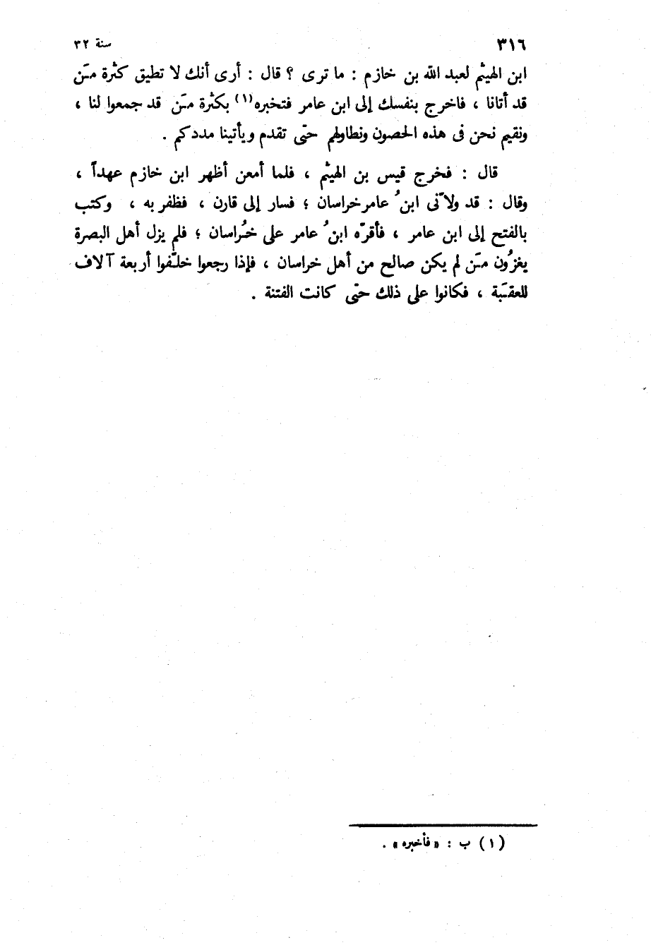 قَالَ: فخرج قيس بن الهيثم، فلما أمعن أظهر ابن خازم عهدا، وَقَالَ: قَدْ ولاني ابن عَامِر خُرَاسَان، فسار إِلَى قارن، فظفر بِهِ، وكتب بالفتح إِلَى ابن عَامِر، فأقره ابن عَامِر عَلَى خُرَاسَان، فلم يزل أهل الْبَصْرَةِ يغزون من لَمْ يَكُنْ صالح من أهل خُرَاسَان، فإذا رجعوا خلفوا أربعة آلاف للعقبة، فكانوا عَلَى ذَلِكَ حَتَّى كانت الفتنة