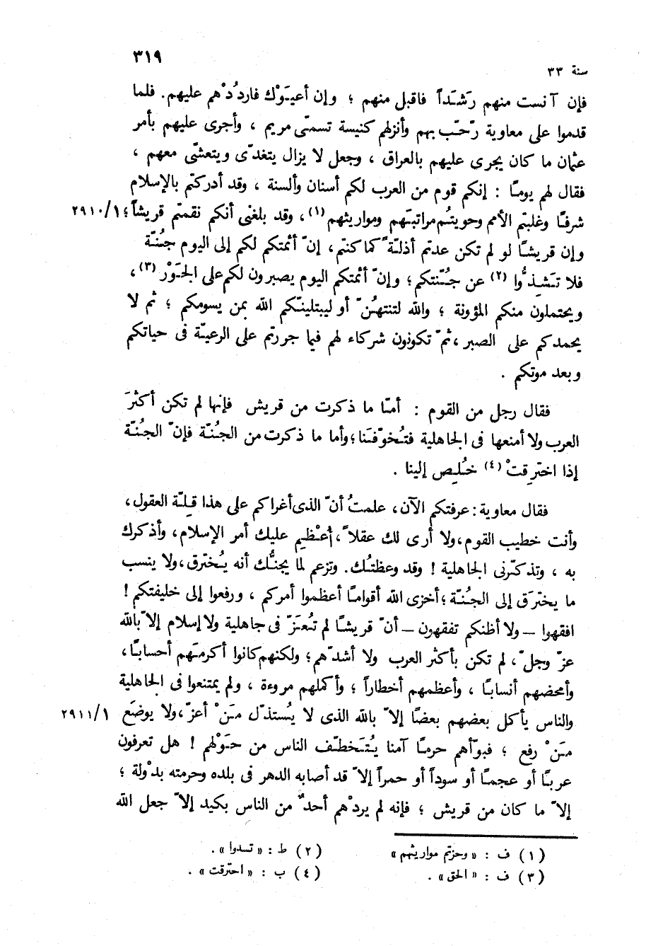 فَقَالَ مُعَاوِيَةُ: عَرَفْتُكُمُ الآنَ، عَلِمْتُ أَنَّ الَّذِي أَغْرَاكُمْ عَلَى هَذَا قِلَّةُ الْعُقُولِ، وَأَنْتَ خَطِيبُ الْقَوْمِ، وَلا أَرَى لَكَ عَقْلا، أُعَظِّمُ عَلَيْكَ أَمْرَ الإِسْلامِ، وَأُذَكِّرُكَ بِهِ، وَتُذَكِّرُنِي الْجَاهِلِيَّةَ! وَقَدْ وَعَظْتُكَ وَتَزْعُمُ لِمَا يَجِنُّكَ أَنَّهُ يُخْتَرَقُ، وَلا يُنْسَبُ مَا يُخْتَرَقُ إِلَى الْجُنَّةِ، أَخْزَى اللَّهُ أَقْوَامًا أَعْظَمُوا أَمْرَكُمْ، وَرَفَعُوا إِلَى خَلِيفَتِكُمْ! افْقَهُوا- وَلا أَظُنُّكُمْ تَفْقَهُونَ- أَنَّ قُرَيْشًا لَمْ تَعِزَّ فِي جَاهِلِيَّةٍ وَلا إِسْلامٍ إِلا بِاللَّهِ عَزَّ وَجَلَّ، لَمْ تَكُنْ بِأَكْثَرِ الْعَرَبِ وَلا أَشَدَّهُمْ، وَلَكِنَّهُمْ كَانُوا أَكْرَمَهُمْ أَحْسَابًا، وَأَمْحَضَهُمْ أَنْسَابًا، وَأَعْظَمَهُمْ أَخْطَارًا، وَأَكْمَلَهُمْ مُرُوءَةً، وَلَمْ يَمْتَنِعُوا فِي الْجَاهِلِيَّةِ وَالنَّاسُ يَأْكُلُ بَعْضُهُمْ بَعْضًا إِلا بِاللَّهِ الَّذِي لا يُسْتَذَلُّ مَنْ أَعَزَّ، وَلا يُوضَعُ مَنْ رَفَعَ، فَبَوَّأَهُمْ حَرَمًا آمِنًا يُتَخَطَّفُ النَّاسَ مِنْ حَوْلِهِمْ! هَلْ تَعْرِفُونَ عُرْبًا أَوْ عُجْمًا أَوْ سُودًا أَوْ حُمْرًا إِلا قَدْ أَصَابَهُ الدَّهْرُ فِي بَلَدِهِ وَحُرْمَتِهِ بِدَوْلَةٍ، إِلا مَا كَانَ مِنْ قُرَيْشٍ، فَإِنَّهُ لَمْ يُرِدْهُمْ أَحَدٌ مِنَ النَّاسِ بِكَيْدٍ إِلا جَعَلَ الله