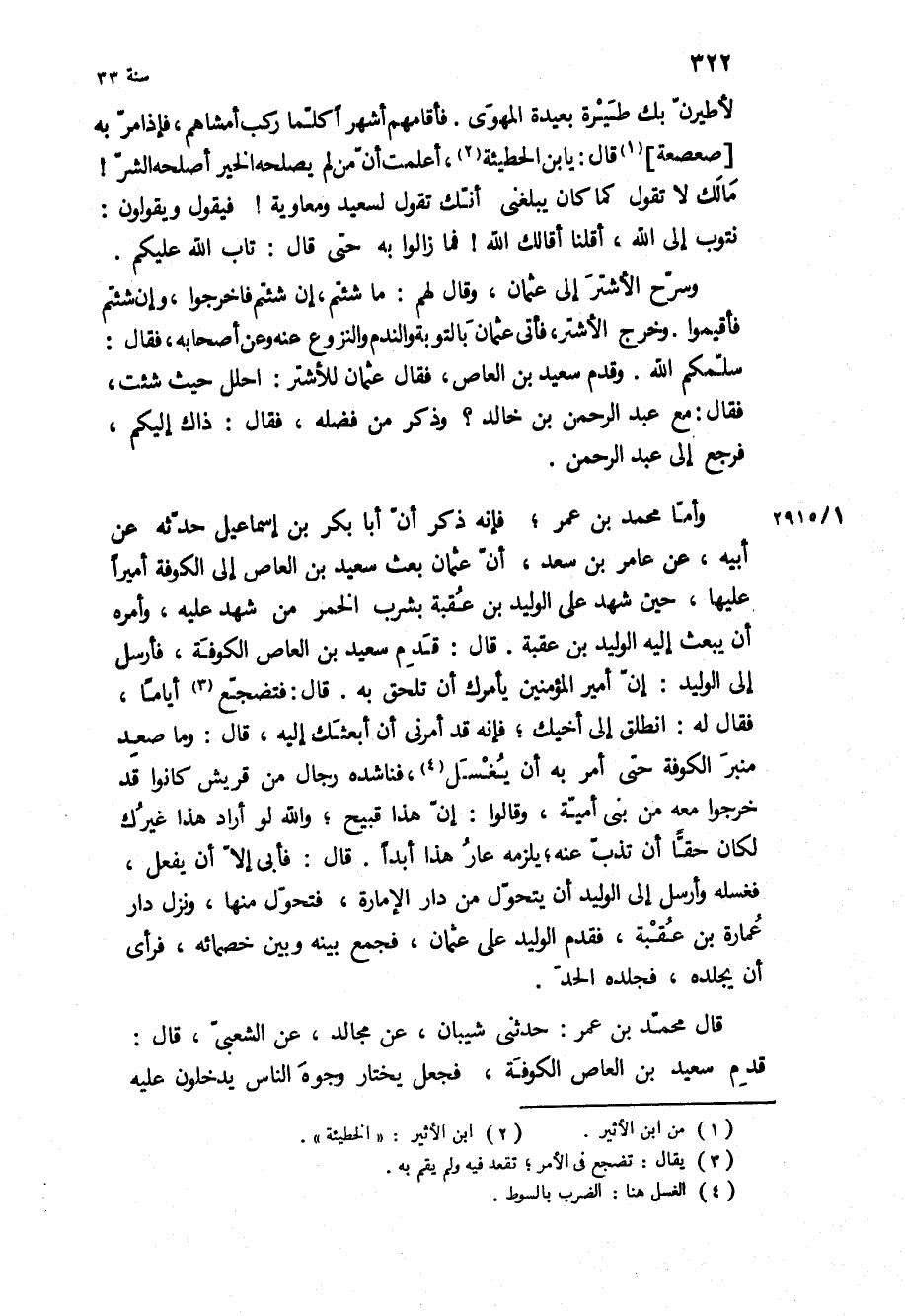 سَلَّمَكُمُ اللَّهُ وَقَدِمَ سَعِيدُ بْنُ الْعَاصِ، فَقَالَ عُثْمَانُ لِلأَشْتَرِ: احْلِلْ حَيْثُ شِئْتَ، فَقَالَ: مَعَ عَبْدِ الرَّحْمَنِ بْنِ خَالِدٍ؟ وَذَكَرَ مِنْ فَضْلِهِ، فَقَالَ: ذَاكَ إِلَيْكُمْ، فَرَجَعَ إِلَى عَبْدِ الرَّحْمَنِ وأَمَّا مُحَمَّدُ بْنُ عُمَرَ، فَإِنَّهُ ذَكَرَ أَنَّ أَبَا بَكْرِ بْنَ إِسْمَاعِيلَ حَدَّثَهُ عَنْ أَبِيهِ، عَنْ عَامِرِ بْنِ سَعْدٍ، أَنَّ عُثْمَانَ بَعَثَ سَعِيدَ بْنَ الْعَاصِ إِلَى الْكُوفَةِ أَمِيرًا عَلَيْهَا، حِينَ شَهِدَ عَلَى الْوَلِيدِ بْنِ عُقْبَةَ بِشُرْبِ الْخَمْرِ مَنْ شَهِدَ عَلَيْهِ، وَأَمَرَهُ أَنْ يَبْعَثَ إِلَيْهِ الْوَلِيدَ بن عقبه قال: قدم سَعِيدُ بْنُ الْعَاصِ الْكُوفَةَ، فَأَرْسَلَ إِلَى الْوَلِيدِ: إِنَّ أَمِيرَ الْمُؤْمِنِينَ يَأْمُرُكَ أَنْ تَلْحَقَ بِهِ قَالَ: فَتَضَجَّعَ أَيَّامًا، فَقَالَ لَهُ: انْطَلِقْ إِلَى أَخِيكَ، فَإِنَّهُ قَدْ أَمَرَنِي أَنْ أَبْعَثَكَ إِلَيْهِ، قَالَ: وَمَا صَعِدَ مِنْبَرَ الْكُوفَةِ حَتَّى أَمَرَ بِهِ أَنْ يُغْسَلَ، فَنَاشَدَهُ رِجَالٌ مِنْ قُرَيْشٍ كَانُوا قَدْ خَرَجُوا مَعَهُ مِنْ بَنِي أُمَيَّةَ، وَقَالُوا: إِنَّ هَذَا قَبِيحٌ، وَاللَّهِ لَوْ أَرَادَ هَذَا غَيْرُكَ لَكَانَ حَقًّا أَنْ تَذُبَّ عَنْهُ، يَلْزَمُهُ عَارُ هَذَا أَبَدًا قَالَ: فَأَبَى إِلا أَنْ يَفْعَلَ، فَغَسَلَهُ وَأَرْسَلَ إِلَى الْوَلِيدِ أَنْ يَتَحَوَّلَ مِنْ دَارِ الإِمَارَةِ، فَتَحَوَّلَ مِنْهَا، وَنَزَلَ دَارَ عُمَارَةَ بْنِ عُقْبَةَ، فَقَدِمَ الْوَلِيدُ عَلَى عُثْمَانَ، فَجَمَعَ بَيْنَهُ وَبَيْنَ خُصَمَائِهِ، فَرَأَى أَنْ يَجْلِدَهُ، فَجَلَدَهُ الْحَدَّ.