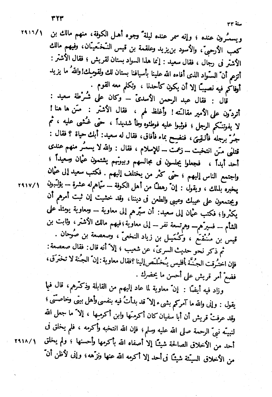 قَتَلَنِي مَنِ انْتَخَبْتُ- زَعَمْت- لِلإِسْلامِ، فَقَالَ: وَاللَّهِ لا يَسْمُرُ مِنْهُمْ عِنْدِي أَحَدٌ أَبَدًا، فَجَعَلُوا يَجْلِسُونَ فِي مَجَالِسِهِمْ وَبُيُوتِهِمْ يَشْتِمُونَ عُثْمَانَ وَسَعِيدًا، وَاجْتَمَعَ النَّاسُ إِلَيْهِمْ، حَتَّى كَثُرَ مَنْ يَخْتَلِفُ إِلَيْهِمْ فَكَتَبَ سَعِيدٌ إِلَى عُثْمَانَ يُخْبِرُهُ بِذَلِكَ، وَيَقُولُ: إِنَّ رَهْطًا مِنْ أَهْلِ الْكُوفَةِ- سَمَّاهُمْ لَهُ عَشَرَةً- يُؤَلِّبُونَ وَيَجْتَمِعُونَ عَلَى عَيْبِكَ وَعَيْبِي وَالطَّعْنِ فِي دِينِنَا، وَقَدْ خَشِيتُ إِنْ ثَبُتَ أَمْرُهُمْ أَنْ يَكْثُرُوا، فَكَتَبَ عُثْمَانُ إِلَى سَعِيدٍ: أَنْ سَيِّرْهُمْ إِلَى مُعَاوِيَةَ- وَمُعَاوِيَةُ يَوْمَئِذٍ عَلَى الشَّامِ- فَسَيَّرَهُمْ- وَهُمْ تِسْعَةُ نَفَرٍ- إِلَى مُعَاوِيَةَ، فِيهِمْ مَالِكٌ الأَشْتَرُ، وَثَابِتُ بْنُ قَيْسِ بْنِ مُنَقَّعٍ، وَكُمَيْلُ بْنُ زِيَادٍ النَّخَعِيُّ، وَصَعْصَعَةُ بْنُ صُوحَانَ.