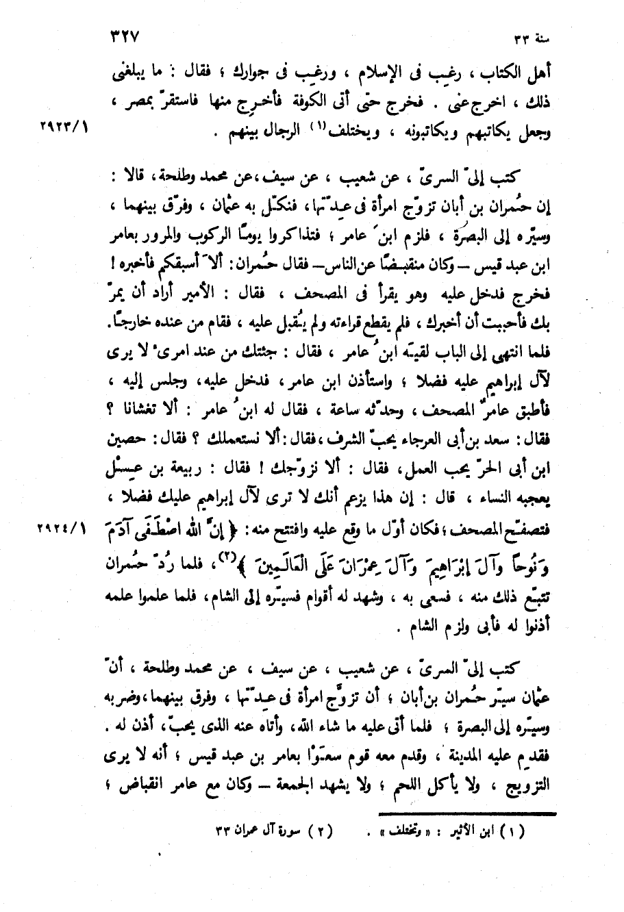 كَتَبَ إِلَيَّ السَّرِيُّ، عَنْ شُعَيْبٍ، عَنْ سَيْفٍ، عَنْ مُحَمَّدٍ وَطَلْحَةَ، أَنَّ عُثْمَانَ سَيَّرَ حُمْرَانَ بْنَ أَبَانٍ، أَنْ تَزَوَّجَ امْرَأَةً فِي عِدَّتِهَا، وَفَرَّقَ بَيْنَهُمَا، وَضَرَبَهُ وَسَيَّرَهُ إِلَى الْبَصْرَةِ، فَلَمَّا أَتَى عَلَيْهِ مَا شَاءَ اللَّهُ، وَأَتَاهُ عَنْهُ الَّذِي يُحِبُّ، أَذِنَ لَهُ.