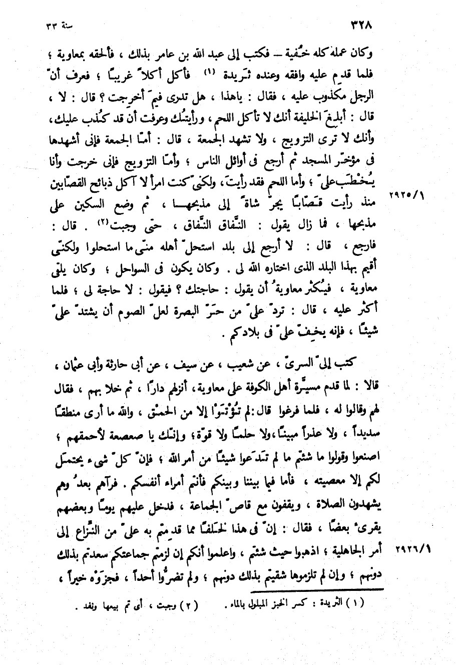 كَتَبَ إِلَيَّ السَّرِيُّ، عَنْ شعيب، عن سيف، عن أبي حارثة وأبي عُثْمَانَ، قَالا: لَمَّا قَدِمَ مسيرة أَهْلِ الْكُوفَةِ عَلَى مُعَاوِيَةَ، أَنْزَلَهُمْ دَارًا، ثُمَّ خَلا بِهِمْ، فَقَالَ لَهُمْ وَقَالُوا لَهُ، فَلَمَّا فَرَغُوا قَالَ: لَمْ تُؤْتَوْا إِلا مِنَ الْحُمْقِ، وَاللَّهِ مَا أَرَى مَنْطِقًا سَدِيدًا، وَلا عُذْرًا مُبِينًا، وَلا حِلْمًا وَلا قُوَّةً، وَإِنَّكَ يَا صَعْصَعَةُ لأَحْمَقُهُمْ، اصْنَعُوا وَقُولُوا مَا شِئْتُمْ مَا لَمْ تَدَّعُوا شَيْئًا مِنْ أَمْرِ اللَّهِ، فَإِنَّ كُلَّ شَيْءٍ يُحْتَمَلُ لَكُمْ إِلا مَعْصِيَتَهُ، فَأَمَّا فِيمَا بَيْنَنَا وَبَيْنَكُمْ فَأَنْتُمْ أُمَرَاءُ أَنْفُسِكُمْ فَرَآهُمْ بَعْدُ وَهُمْ يَشْهَدُونَ الصَّلاةَ، وَيَقِفُونَ مَعَ قَاصِّ الْجَمَاعَةِ، فَدَخَلَ عَلَيْهِمْ يَوْمًا وَبَعْضُهُمْ يُقْرِئُ بَعْضًا، فَقَالَ: إِنَّ فِي هَذَا لَخَلَفًا مِمَّا قَدِمْتُمْ بِهِ عَلَيَّ مِنَ النِّزَاعِ إِلَى أَمْرِ الْجَاهِلِيَّةِ، اذْهَبُوا حَيْثُ شِئْتُمْ، وَاعْلَمُوا أَنَّكُمْ إِنْ لَزِمْتُمْ جَمَاعَتَكُمْ سَعِدْتُمْ بِذَلِكَ دُونَهُمْ، وَإِنْ لَمْ تَلْزَمُوهَا شَقِيتُمْ بِذَلِكَ دُونَهُمْ، وَلَمْ تَضُرُّوا أَحَدًا، فَجَزَوْهُ خَيْرًا،