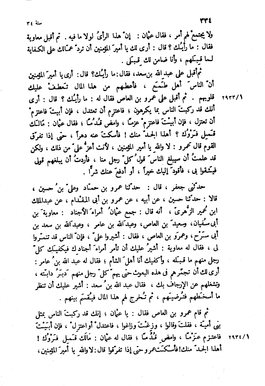 ثُمَّ أَقْبَلَ عَلَى عَبْدِ اللَّهِ بْنِ سَعْدٍ، فَقَالَ: مَا رَأْيُكَ؟ قَالَ: أَرَى يَا أَمِيرَ الْمُؤْمِنِينَ أَنَّ النَّاسَ أَهْلُ طَمَعٍ، فَأَعْطِهِمْ مِنْ هَذَا الْمَالِ تَعْطِفْ عَلَيْكَ قُلُوبُهُمْ ثُمَّ أَقْبَلَ عَلَى عَمْرِو بْنِ الْعَاصِ فَقَالَ لَهُ: مَا رَأْيُكَ؟ قَالَ: أَرَى أَنَّكَ قَدْ رَكِبْتَ النَّاسَ بِمَا يَكْرَهُونَ، فَاعْتَزِمْ أَنْ تَعْتِدَلَ، فَإِنْ أَبَيْتَ فَاعْتَزِمْ أَنْ تَعْتَزِلَ، فَإِنْ أَبَيْتَ فَاعْتَزِمْ عَزْمًا، وَامْضِ قُدُمًا، فَقَالَ عُثْمَانُ: مَا لَكَ قَمِلَ فَرْوُكَ؟ أَهَذَا الْجَدُّ مِنْكَ! فَأُسْكِتَ عَنْهُ دَهْرًا، حَتَّى إِذَا تَفَرَّقَ الْقُومُ قَالَ عَمْرٌو: لا وَاللَّهِ يَا أَمِيرَ الْمُؤْمِنِينَ، لأَنْتَ أَعَزُّ عَلَيَّ مِنْ ذَلِكَ، وَلَكِنْ قَدْ عَلِمْتُ أَنْ سَيَبْلُغَ النَّاسَ قَوْلُ كُلِّ رَجُلٍ مِنَّا، فَأَرَدْتُ أَنْ يَبْلُغَهُمْ قَوْلِي فَيَثِقُوا بِي، فَأَقُودُ إِلَيْكَ خَيْرًا، أَوْ أَدْفَعُ عَنْكَ شَرًّا حَدَّثَنِي جَعْفَرٌ، قَالَ: حدثنا عمرو بن حماد وعلي بن حسين، قَالا: حَدَّثَنَا حُسَيْنٌ، عَنْ أَبِيهِ، عَنْ عَمْرِو بن ابى المقدام، عن عبد الملك ابن عُمَيْرٍ الزُّهْرِيِّ، أَنَّهُ قَالَ: جَمَعَ عُثْمَانُ أُمَرَاءَ الأَجْنَادِ: مُعَاوِيَةَ بْنَ أَبِي سُفْيَانَ، وَسَعِيدَ بْنَ الْعَاصِ، وَعَبْدَ اللَّهِ بْنَ عَامِرٍ، وَعَبْدَ اللَّهِ بْنَ سَعْدِ بْنِ أَبِي سَرْحٍ، وَعَمْرَو بْنَ الْعَاصِ، فَقَالَ: أَشِيرُوا عَلَيَّ، فَإِنَّ النَّاسَ قَدْ تَنَمَّرُوا لِي، فَقَالَ لَهُ مُعَاوِيَةُ: أُشِيرُ عَلَيْكَ أَنْ تَأْمُرَ أُمَرَاءَ أَجْنَادِكَ فَيَكْفِيكَ كُلُّ رَجُلٍ مِنْهُمْ مَا قِبَلَهُ، وَأَكْفِيكَ أَنَا أَهْلَ الشَّامِ، فَقَالَ لَهُ عَبْدُ اللَّهِ بْنُ عَامِرٍ: