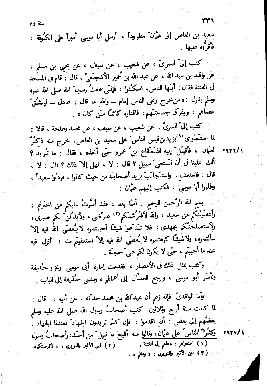كَتَبَ إِلَيَّ السَّرِيُّ، عَنْ شُعَيْبٍ، عَنْ سيف، عَنْ يَحْيَى بْنِ مُسْلِمٍ، عَنْ وَاقِدِ بْنِ عَبْدٍ اللَّهِ، عَنْ عَبْدِ اللَّهِ بْنِ عُمَيْرٍ الأَشْجَعِيِّ، قَالَ: قَامَ فِي الْمَسْجِدِ فِي الْفِتْنَةِ فَقَالَ: أَيُّهَا النَّاسُ، اسْكُتُوا، [فَإِنِّي سَمِعْتُ رَسُولَ الله ص يَقُولُ: مَنْ خَرَجَ وَعَلَى النَّاسِ إِمَامٌ- وَاللَّهِ مَا قَالَ: عَادِلٌ- لِيَشُقَّ عَصَاهُمْ، وَيُفَرِّقَ جَمَاعَتَهُمْ، فَاقْتُلُوهُ كَائِنًا مَنْ كَانَ] .