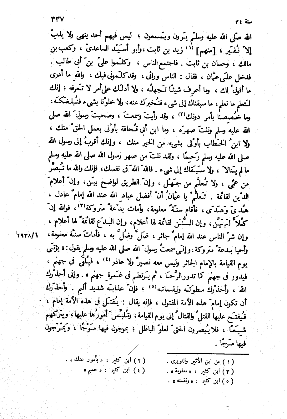 فَدَخَلَ عَلَى عُثْمَانَ، فَقَالَ: النَّاسُ وَرَائِي، وَقَدْ كَلَّمُونِي فِيكَ، وَاللَّهِ مَا أَدْرِي مَا أَقُولُ لَكَ، وَمَا أَعْرِفُ شَيْئًا تَجْهَلُهُ، وَلا أَدُلُّكَ عَلَى أَمْرٍ لا تَعْرِفُهُ، إِنَّكَ لَتَعْلَمُ مَا نَعْلَمُ، مَا سَبَقْنَاكَ إِلَى شَيْءٍ فَنُخْبِرَكَ عَنْهُ، وَلا خَلَوْنَا بِشَيْءٍ فَنِبْلِغَكَهُ، وَمَا خُصِصْنَا بِأَمْرٍ دُونَكَ، وَقَدْ رَأَيْتَ وَسَمِعْتَ، وَصَحِبْتَ رسول الله ص وَنِلْتَ صِهْرَهُ، وَمَا ابْنُ أَبِي قُحَافَةَ بِأَوْلَى بِعَمَلِ الْحَقِّ مِنْكَ، وَلا ابْنُ الْخَطَّابِ بِأَوْلَى شيء مِنَ الْخَيْرِ مِنْكَ، وَإِنَّكَ أَقْرَبُ إِلَى رَسُولِ الله ص رَحِمًا، وَلَقَدْ نِلْتَ مِنْ صِهْرِ رَسُولِ اللَّهِ ص مَا لَمْ يَنَالا، وَلا سَبَقَاكَ إِلَى شَيْءٍ فَاللَّهَ اللَّهَ فِي نَفْسِكَ، فَإِنَّكَ وَاللَّهِ مَا تُبْصِرُ مِنْ عَمَى، وَلا تَعْلَمُ مِنْ جَهْلٍ، وَإِنَّ الطَّرِيقَ لَوَاضِحٌ بَيِّنٌ، وَإِنَّ أَعْلامَ الدِّينِ لَقَائِمَةٌ تَعَلَّمْ يَا عُثْمَانُ أَنَّ أَفْضَلَ عِبَادِ اللَّهِ عِنْدَ اللَّهِ إِمَامٌ عَادِلٌ، هُدِيَ وَهَدَى، فأقام سنه معلومه، وأمات بدعه متروكه، فو الله إِنَّ كُلا لَبِيِّنٌ، وَإِنَّ السُّنَنَ لَقَائِمَةٌ لَهَا أَعْلامٌ، وَإِنَّ الْبِدَعَ لَقَائِمَةٌ لَهَا أَعْلامٌ، وَإِنَّ شَرَّ النَّاسِ عِنْدَ اللَّهِ إِمَامٌ جَائِرٌ، ضَلَّ وَضُلَّ بِهِ، فَأَمَاتَ سُنَّةً مَعْلُومَةً، وَأَحْيَا بِدْعَةً متروكه، وانى سمعت رسول الله ص يَقُولُ: يُؤْتَى يَوْمَ الْقِيَامَةِ بِالإِمَامِ الْجَائِرِ وَلَيْسَ مَعَهُ نَصِيرٌ وَلا عَاذِرٌ، فَيُلْقَى فِي جَهَنَّمَ، فَيَدُورُ فِي جَهَنَّمَ كَمَا تَدُورُ الرَّحَا، ثُمَّ يَرْتَطِمُ فِي غَمْرَةِ جَهَنَّمَ وَإِنِّي أُحَذِّرُكَ اللَّهَ، وَأُحَذِّرُكَ سَطْوَتَهُ وَنَقَمَاتِهِ، فَإِنَّ عَذَابَهُ شَدِيدٌ أَلِيمٌ وَأُحَذِّرُكَ أَنْ تَكُونَ إِمَامَ هَذِهِ الأُمَّةِ الْمُقْتُولُ، فَإِنَّهُ يُقَالُ: يُقْتَلُ فِي هَذِهِ الأُمَّةِ إِمَامٌ، فَيَفْتَحُ عَلَيْهَا الْقَتْلُ وَالْقِتَالُ إِلَى يَوْمِ الْقِيَامَةِ، وَتُلْبَسُ أُمُورُهَا عَلَيْهَا، وَيَتْرُكُهُمْ شِيَعًا، فَلا يُبْصِرُونَ الْحَقَّ لِعُلُوِّ الْبَاطِلِ، يَمُوجُونَ فِيهَا مَوْجًا، وَيَمْرِجُونَ فيها مرجا]