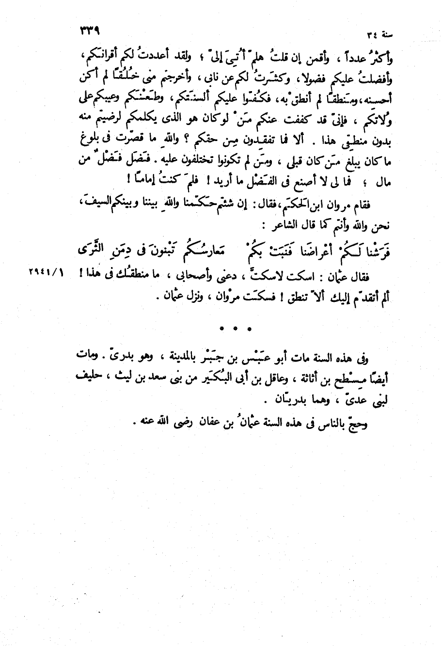وَأَكْثَرُ عَدَدًا، وَأَقْمَنُ إِنْ قُلْتُ هَلُمَّ أُتِيَ إِلَيَّ، وَلَقَدْ أَعْدَدْتُ لَكُمْ أَقْرَانَكُمْ، وَأَفْضَلْتُ عَلَيْكُمْ فُضُولا، وَكَشَّرْتُ لَكُمْ عَنْ نَابِي، وَأَخْرَجْتُمْ مِنِّي خُلُقًا لَمْ أَكُنْ أُحْسِنُهُ، وَمَنْطِقَا لَمْ أَنْطِقْ بِهِ، فَكُفُّوا عَلَيْكُمْ أَلْسِنَتَكُمْ، وَطَعْنَكُمْ وَعَيْبَكُمْ عَلَى وُلاتِكُمْ، فَإِنِّي قَدْ كَفَفْتُ عَنْكُمْ مَنْ لَوْ كَانَ هُوَ الَّذِي يُكَلِّمُكُمْ لَرَضِيتُمْ مِنْهُ بِدُونِ مَنْطِقِي هَذَا أَلا فَمَا تَفْقِدُونَ مِنْ حَقِّكُمْ؟ وَاللَّهِ مَا قَصَّرْتُ فِي بُلُوغِ مَا كَانَ يَبْلُغُ مَنْ كَانَ قَبْلِي، وَمَنْ لَمْ تَكُونُوا تَخْتَلِفُونَ عَلَيْهِ فَضْلَ فَضْلٍ مِنْ مَالٍ، فَمَا لِي لا أَصْنَعُ فِي الْفَضْلِ مَا أُرِيدُ! فلم كنت اماما! فقام مروان ابن الْحَكَمِ، فَقَالَ: إِنْ شِئْتُمْ حَكَّمْنَا وَاللَّهِ بَيْنَنَا وَبَيْنَكُمُ السَّيْفَ، نَحْنُ وَاللَّهِ وَأَنْتُمْ كَمَا قَالَ الشَّاعِرُ: