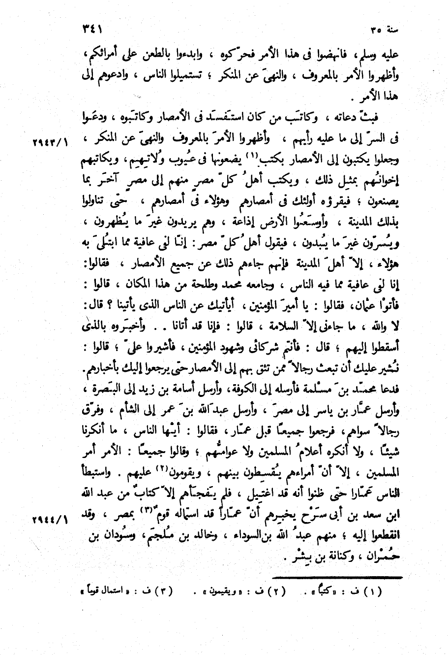 فبث دعاته، وكاتب من كَانَ استفسد فِي الأمصار وكاتبوه، ودعوا فِي السر إِلَى مَا عَلَيْهِ رأيهم، وأظهروا الأمر بالمعروف والنهي عن المنكر، وجعلوا يكتبون إِلَى الأمصار بكتب يضعونها فِي عيوب ولاتهم، ويكاتبهم إخوانهم بمثل ذَلِكَ، ويكتب أهل كل مصر مِنْهُمْ إِلَى مصر آخر بما يصنعون، فيقرؤه أُولَئِكَ فِي أمصارهم وهؤلاء فِي أمصارهم، حَتَّى تناولوا بِذَلِكَ الْمَدِينَة، وأوسعوا الأرض إذاعة، وهم يريدون غير مَا يظهرون، ويسرون غير مَا يبدون، فيقول أهل كل مصر: إنا لفي عافيه مما ابتلي بِهِ هَؤُلاءِ، إلا أهل الْمَدِينَة فإنهم جاءهم ذَلِكَ عن جميع الأمصار، فَقَالُوا: