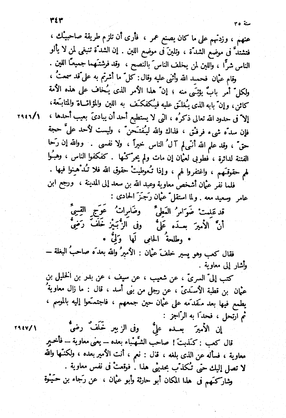 كَتَبَ إِلَيَّ السَّرِيُّ، عَنْ شُعَيْبٍ، عَنْ سَيْفٍ، عن بدر بن الخليل بن عُثْمَانَ بن قطبة الأسدي، عن رجل من بني أسد، قَالَ: مَا زال مُعَاوِيَة يطمع فِيهَا بعد مقدمه عَلَى عُثْمَانَ حين جمعهم، فاجتمعوا إِلَيْهِ بالموسم، ثُمَّ ارتحل، فحدا بِهِ الراجز: