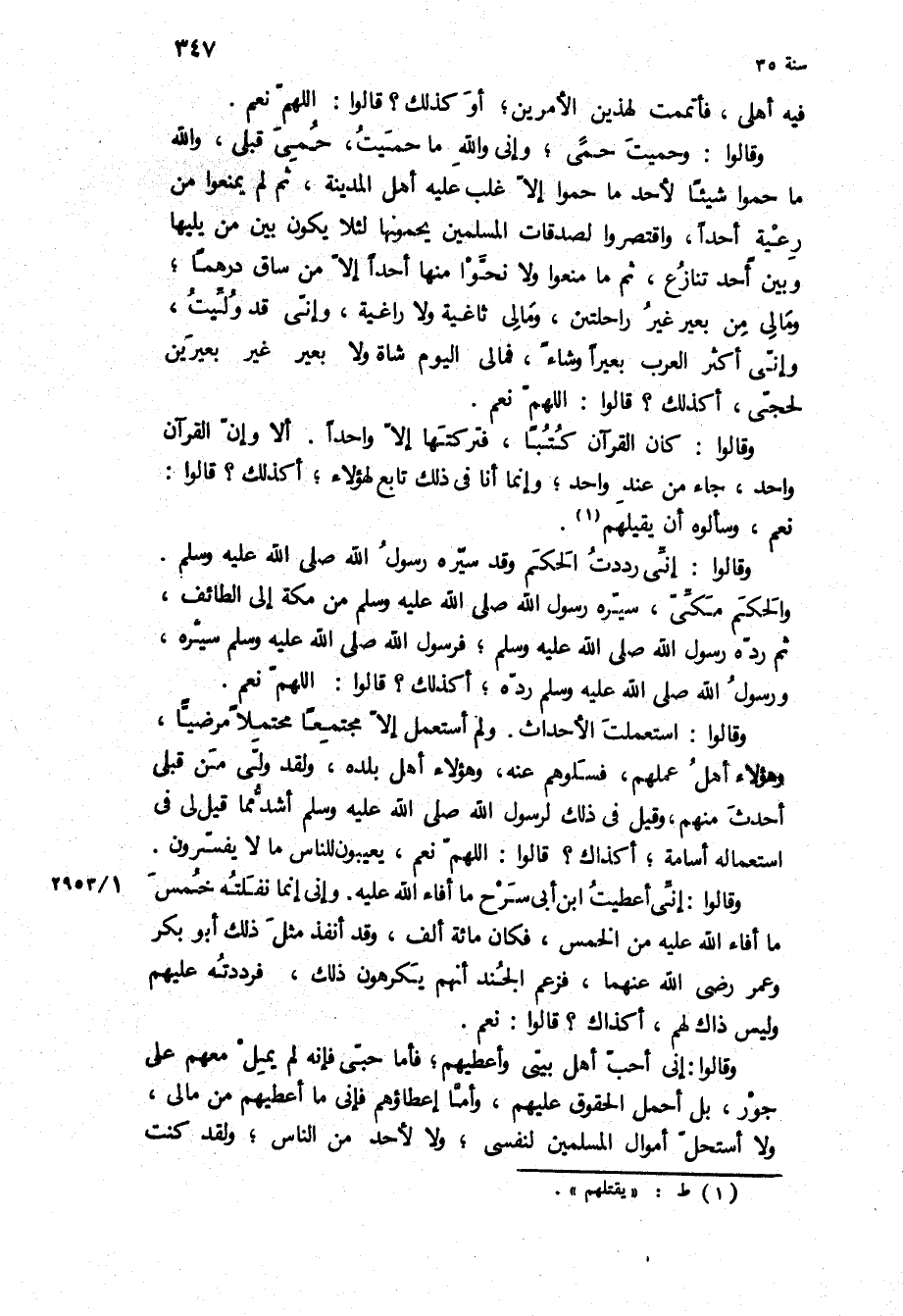 وَقَالُوا: إني أعطيت ابن أبي سرح مَا أفاء اللَّه عَلَيْهِ وإني إنما نفلته خمس مَا أفاء اللَّه عَلَيْهِ من الخمس، فكان مائة ألف، وَقَدْ أنفذ مثل ذَلِكَ أَبُو بَكْر وعمر رضي اللَّه عنهما، فزعم الجند أَنَّهُمْ يكرهون ذَلِكَ، فرددته عَلَيْهِم وليس ذاك لهم، اكذاك؟ قَالُوا: نعم.