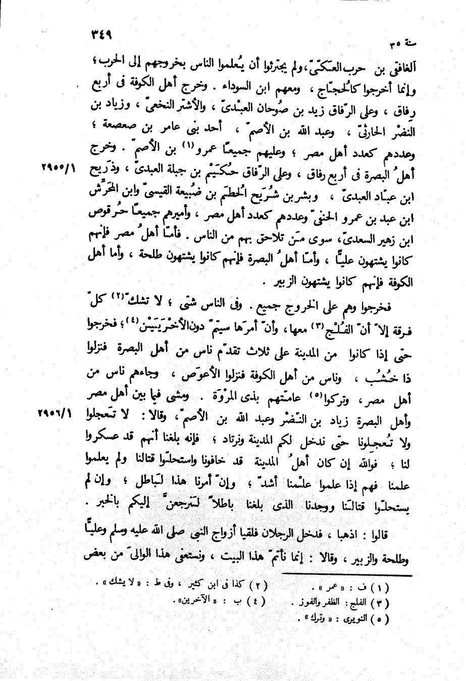 الغافقي بن حرب العكي، ولم يجترئوا أن يعلموا الناس بخروجهم إِلَى الحرب، وإنما اخرجوا كالحجاج، ومعهم ابن السوداء وخرج أهل الْكُوفَة فِي أربع رفاق، وعلى الرفاق زَيْد بن صُوحَانَ العبدي، والأشتر النخعي، وزياد بن النضر الحارثي، وعبد اللَّه بن الأصم، أحد بني عَامِر بن صعصعة، وعددهم كعدد أهل مصر، وعليهم جميعا سبعا عَمْرو بن الأصم وخرج أهل الْبَصْرَة فِي أربع رفاق، وعلى الرفاق حكيم بن جبلة العبدى، وذريح ابن عباد العبدي، وبشر بن شريح الحطم بن ضبيعه القيسى وابن المحرش ابن عبد بن عَمْرو الحنفي وعددهم كعدد أهل مصر وأميرهم جميعا حرقوص ابن زهير السعدي، سوى من تلاحق بهم مِنَ الناس فاما اهل مصر فإنهم كانوا يشتهون عَلِيًّا، وأما أهل الْبَصْرَة فإنهم كَانُوا يشتهون طَلْحَة، وأما أهل الْكُوفَة فإنهم كَانُوا يشتهون الزُّبَيْر فخرجوا وهم عَلَى الخروج جميع وفي الناس شتى، لا تشك كل فرقة إلا أن الفلج معها، وأن أمرها سيتم دون الأخريين، فخرجوا حَتَّى إذا كَانُوا مِنَ الْمَدِينَةِ عَلَى ثلاث تقدم ناس من أهل الْبَصْرَة فنزلوا ذا خشب، وناس من أهل الْكُوفَة فنزلوا الأعوص، وجاءهم ناس من أهل مصر، وتركوا عامتهم بذي المروة ومشى فِيمَا بين أهل مصر وأهل الْبَصْرَة زياد بن النضر وعبد اللَّه بن الأصم، وقالا: لا تعجلوا وَلا تعجلونا حَتَّى ندخل لكم الْمَدِينَة ونرتاد، فإنه بلغنا أَنَّهُمْ قَدْ عسكروا لنا، فو الله إن كَانَ أهل الْمَدِينَة قَدْ خافونا واستحلوا قتالنا ولم يعلموا علمنا فهم إذا علموا علمنا أشد، وإن أمرنا هَذَا لباطل، وإن لم يستحلوا قتالنا ووجدنا الَّذِي بلغنا باطلا لنرجعن إليكم بالخبر.