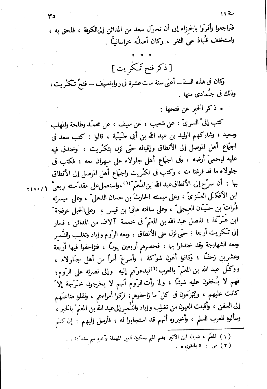 وَكَانَ فِي هَذِهِ السَّنَةِ- أَعْنِي سَنَةَ سِتَّ عَشْرَةَ فِي رِوَايَةِ سَيْفٍ- فَتْحُ تِكْرِيتَ، وَذَلِكَ فِي جُمَادَى مِنْهَا.