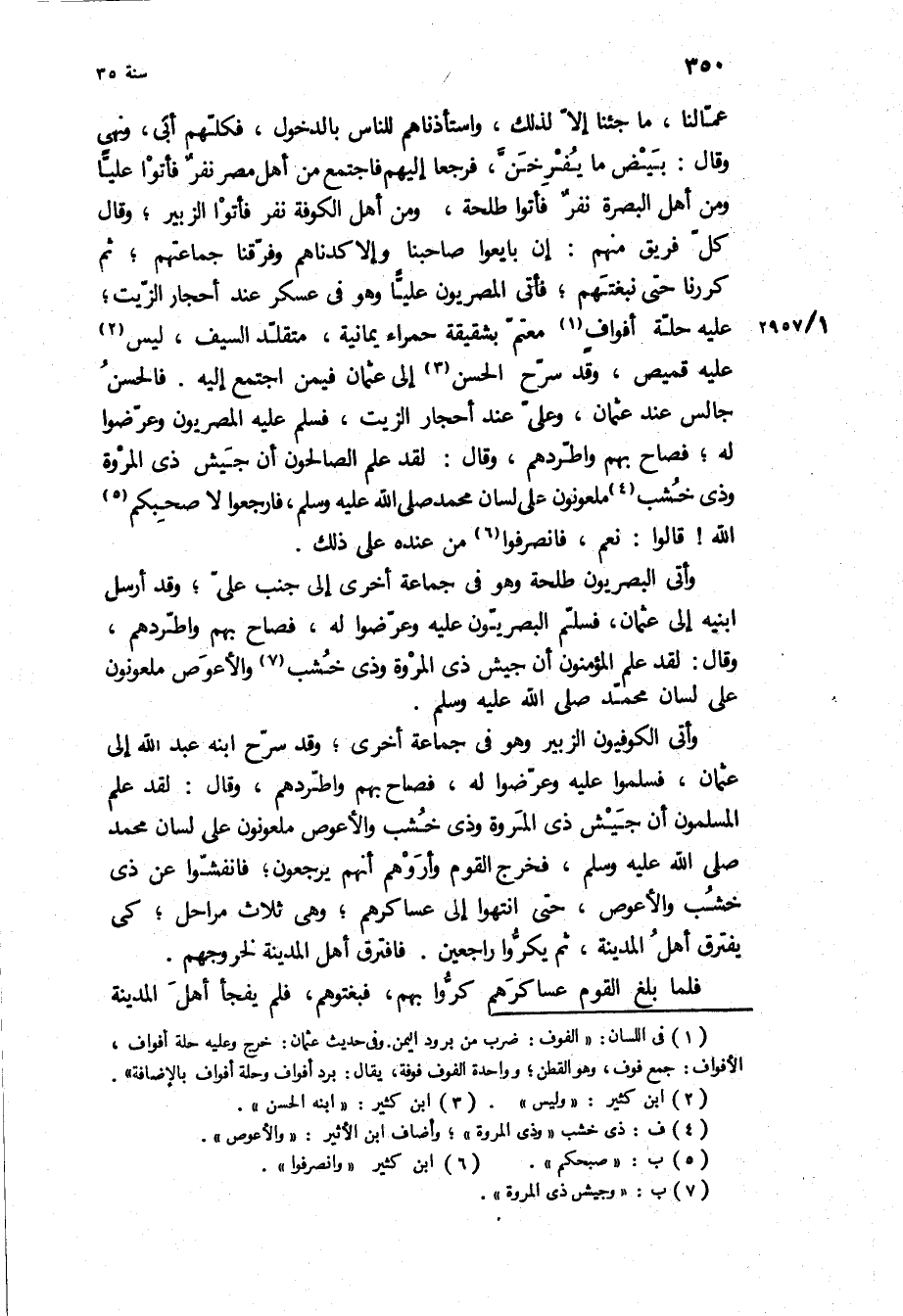 عمالنا، مَا جئنا إلا لذلك، واستأذناهم لِلنَّاسِ بالدخول، فكلهم أبى، ونهى وَقَالَ: بيض مَا يفرخن، فرجعا إِلَيْهِم فاجتمع من أهل مصر نفر فأتوا عَلِيًّا ومن أهل الْبَصْرَة نفر فأتوا طَلْحَة، ومن أهل الْكُوفَة نفر فأتوا الزُّبَيْر، وَقَالَ كل فريق مِنْهُمْ: إن بايعوا صاحبنا وإلا كدناهم وفرقنا جماعتهم، ثُمَّ كررنا حَتَّى نبغتهم، فأتى الْمِصْرِيُّونَ عَلِيًّا وَهُوَ فِي عسكر عِنْدَ أحجار الزيت، عَلَيْهِ حلة أفواف معتم بشقيقة حمراء يمانية، متقلد السيف، ليس عَلَيْهِ قميص، وَقَدْ سرح الْحَسَن إِلَى عُثْمَانَ فيمن اجتمع إِلَيْهِ فالحسن جالس عِنْدَ عُثْمَان، وعلي عِنْدَ أحجار الزيت، فسلم عَلَيْهِ الْمِصْرِيُّونَ وعرضوا لَهُ، فصاح بهم واطردهم، وَقَالَ: لقد علم الصالحون أن جيش ذي المروة وذي خشب ملعونون على لسان محمد ص، فارجعوا لاصحبكم اللَّه! قَالُوا: نعم، فانصرفوا من عنده عَلَى ذَلِكَ.