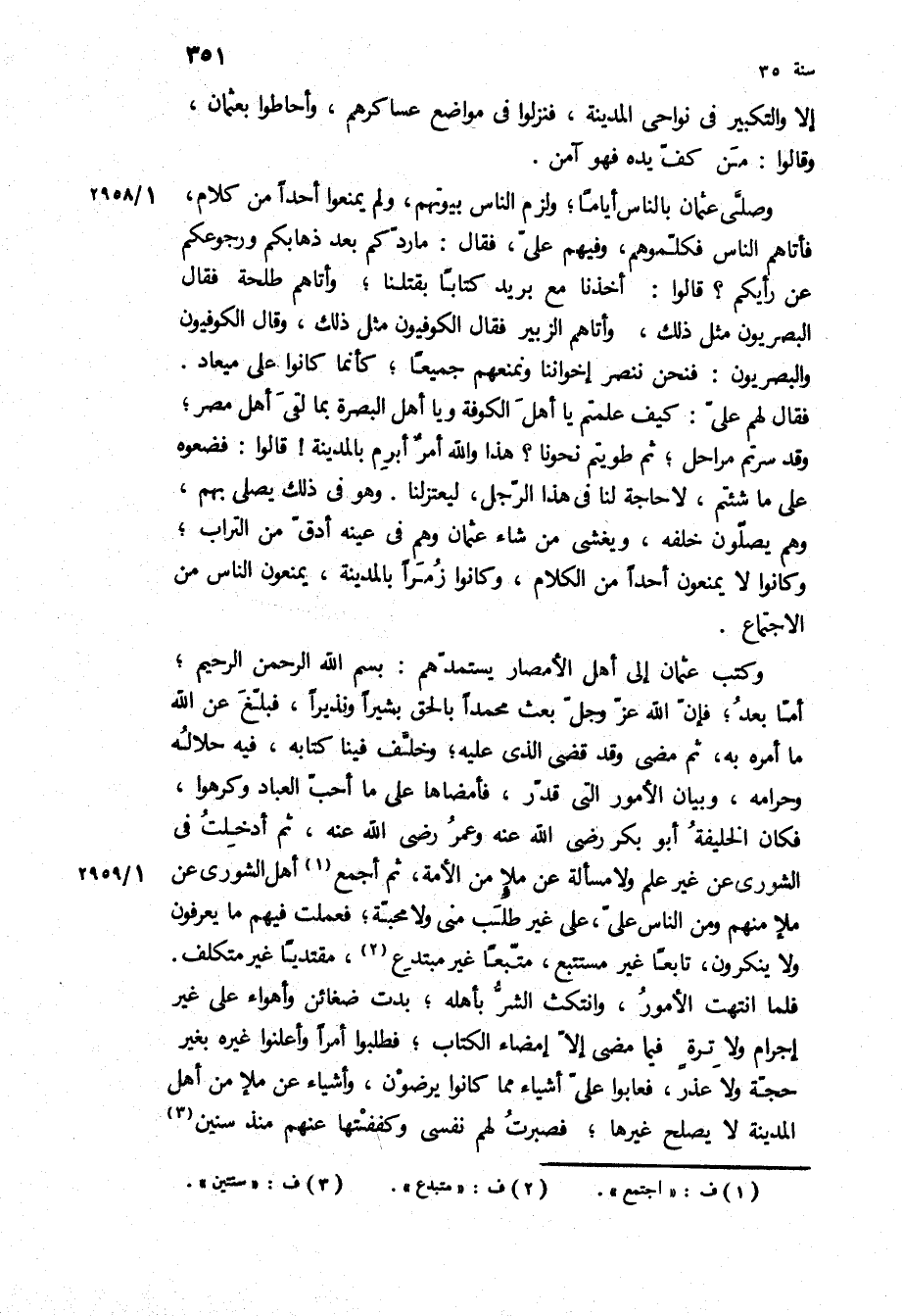 وكتب عُثْمَان إِلَى أهل الأمصار يستمدهم: بسم الله الرحمن الرحيم، أما بعد، فإن اللَّه عَزَّ وَجَلَّ بعث محمدا بالحق بشيرا ونذيرا، فبلغ عن اللَّه مَا أمره بِهِ، ثُمَّ مضى وَقَدْ قضى الَّذِي عَلَيْهِ، وخلف فينا كتابه، فِيهِ حلاله وحرامه، وبيان الأمور الَّتِي قدر، فأمضاها عَلَى مَا أحب العباد وكرهوا، فكان الخليفة أَبُو بَكْر رَضِيَ اللَّهُ عَنْهُ وعمر رَضِيَ اللَّهُ عَنْهُ، ثُمَّ أدخلت فِي الشورى عن غير علم وَلا مسألة عن ملإ من الأمة، ثُمَّ أجمع أهل الشورى عن ملإ مِنْهُمْ ومن الناس علي، عَلَى غير طلب مني وَلا محبة، فعملت فِيهِمْ مَا يعرفون وَلا ينكرون، تابعا غير مستتبع، متبعا غير مبتدع، مقتديا غير متكلف.