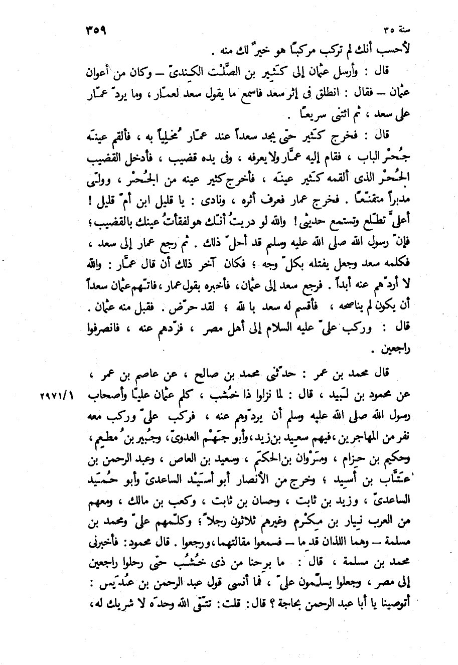 قَالَ: فَخَرَجَ كَثِيرٌ حَتَّى يَجِدَ سَعْدًا عِنْدَ عَمَّارٍ مَخْلِيًّا بِهِ، فَأَلْقَمَ عَيْنَهُ جُحْرَ الْبَابِ، فَقَامَ إِلَيْهِ عَمَّارٌ وَلا يَعْرِفُهُ، وَفِي يَدِهِ قَضِيبٌ، فَأَدْخَلَ الْقَضِيبُ الْجُحْرَ الَّذِي أَلْقَمَهُ كَثِيرٌ عَيْنَهُ، فَأَخْرَجَ كَثِيرٌ عَيْنَهُ مِنَ الْجُحْرِ، وَوَلَّى مُدْبِرًا مُتَقَنِّعًا فَخَرَجَ عَمَّارٌ فَعَرَفَ أَثَرَهُ، وَنَادَى: يَا قَلِيلُ ابْنَ أُمِّ قَلِيلٍ! أَعَلَيَّ تَطَّلِعُ وَتَسْتَمِعُ حَدِيثِي! وَاللَّهِ لَوْ دَرِيتُ أَنَّكَ هُوَ لَفَقَأْتُ عَيْنَكَ بِالْقَضِيبِ، فان رسول الله ص قَدْ أَحَلَّ ذَلِكَ ثُمَّ رَجَعَ عَمَّارٌ إِلَى سَعْدٍ، فَكَلَّمَهُ سَعْدٌ وَجَعَلَ يَفْتِلُهُ بِكُلِّ وَجْهٍ، فَكَانَ آخَرُ ذَلِكَ أَنْ قَالَ عَمَّارٌ: وَاللَّهِ لا أَرُدُّهُمْ عَنْهُ أَبَدًا فَرَجَعَ سَعْدٌ إِلَى عُثْمَانَ، فَأَخْبَرَهُ بِقَوْلِ عَمَّارٌ، فَاتَّهَمَ عُثْمَانُ سَعْدًا أَنْ يَكُونَ لَمْ يُنَاصِحْهُ، فَأَقْسَمَ لَهُ سَعْدٌ بِاللَّهِ، لَقَدْ حُرِّضَ فَقَبِلَ مِنْهُ عُثْمَانُ.