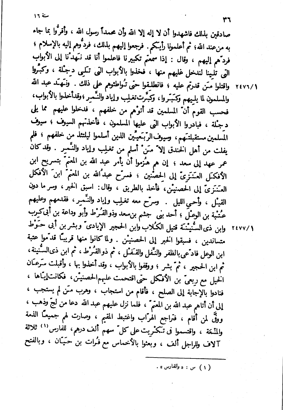صَادِقِينَ بِذَلِكَ فَاشْهَدُوا أَنْ لَا إِلَهَ إِلَّا اللَّهُ وَأَنَّ مُحَمَّدًا رَسُولُ اللَّهِ، وَأَقِرُّوا بِمَا جَاءَ بِهِ مِنْ عِنْدِ اللَّهِ، ثُمَّ أَعْلِمُونَا رَأْيَكُمْ فَرَجَعُوا إِلَيْهِمْ بِذَلِكَ، فَرَدُّوهُمْ إِلَيْهِ بِالإِسْلامِ، فَرَدَّهُمْ إِلَيْهِمْ، وَقَالَ: إِذَا سَمِعْتُمْ تَكْبِيرَنَا فَاعْلَمُوا أَنَّا قَدْ نَهَدْنَا إِلَى الأَبْوَابِ الَّتِي تَلِينَا لِنَدْخُلَ عَلَيْهِمْ مِنْهَا، فَخُذُوا بِالأَبْوَابِ الَّتِي تَلِي دِجْلَةَ، وَكَبِّرُوا وَاقْتُلُوا مَنْ قَدَرْتُمْ عَلَيْهِ، فَانْطَلِقُوا حَتَّى تُوَاطِئُوهُمْ عَلَى ذَلِكَ وَنَهَدَ عَبْدُ اللَّهِ وَالْمُسْلِمُونَ لِمَا يَلِيهِمْ وَكَبَّرُوا، وَكَبَّرَتْ تَغْلِبُ وَإِيَادٌ وَالنَّمِرُ، وَقَدْ أَخَذُوا بِالأَبْوَابِ، فَحَسِبَ الْقَوْمُ أَنَّ الْمُسْلِمِينَ قَدْ أَتَوْهُمْ مِنْ خَلْفِهِمْ، فَدَخَلُوا عَلَيْهِمْ مِمَّا يَلِي دِجْلَةَ، فَبَادَرُوا الأَبْوَابَ الَّتِي عَلَيْهَا الْمُسْلِمُونَ، فَأَخَذَتْهُمُ السُّيُوفُ، سُيُوفُ الْمُسْلِمِينَ مُسْتَقْبِلَتُهُمْ، وَسُيُوف الربعيين الذين أسلموا ليتئذ مِنْ خَلْفِهِمْ، فَلَمْ يُفْلِتْ مِنْ أَهْلِ الخْنَدْقِ إِلا مَنْ أَسْلَمَ مِنْ تَغْلِبَ وَإِيَادٍ وَالنَّمِرِ وَقَدْ كَانَ عُمَرُ عَهِدَ إِلَى سَعْدٍ، إِنْ هُمْ هُزِمُوا أَنْ يَأْمُرَ عَبْدَ اللَّهِ بْنَ الْمُعْتَمِّ بِتَسْرِيحِ ابْنِ الأَفْكَلِ الْعَنَزِيِّ إِلَى الْحِصْنَيْنِ، فَسَرَّحَ عَبْدُ اللَّهِ بْنُ الْمُعْتَمِّ ابْنَ الأَفْكَلِ الْعَنَزِيَّ إِلَى الْحِصْنَيْنِ، فَأَخَذَ بِالطَّرِيقِ، وَقَالَ: اسْبِقِ الخبر، وسر ما دون القيل، واحى اللَّيْلَ وَسَرِّحْ مَعَهُ تَغْلِبَ وَإِيَادَ وَالنَّمِرَ، فَقَدِّمْهُمْ وَعَلَيْهِمْ عُتْبَةُ بْنُ الْوَعْلِ، أَحَدُ بَنِي جُشَمِ بْنِ سَعْدٍ وَذُو الْقِرْطِ وَأَبُو وَدَاعَةَ بْنُ أَبِي كَرِبٍ وَابْنُ ذِي السُّنَيْنَةِ قَتِيلُ الْكِلابِ وَابْنُ الْحُجَيْرِ الإِيَادِيُّ وَبِشْرُ بْنُ أَبِي حَوْطٍ مُتَسَانِدِينَ، فَسَبَقُوا الْخَبَرَ إِلَى الْحِصْنَيْنِ وَلَمَّا كَانُوا منها قريبا قدموا عتبة ابن الْوَعْلِ فَادَّعَى بِالظَّفْرِ وَالنَّفْلِ وَالْقَفْلِ، ثُمَّ ذُو الْقِرْطِ، ثُمَّ ابْنُ ذِي السُّنَيْنَةِ، ثُمَّ ابْنُ الْحَجِيرِ، ثُمَّ بِشْرٌ، وَوَقَفُوا بِالأَبْوَابِ، وَقَدْ أَخَذُوا بِهَا، وَأَقْبَلَتْ سَرَعَانُ الْخَيْلِ مَعَ رِبْعِيِّ بْنِ الأَفْكَلِ حَتَّى اقْتَحَمَتْ عَلَيْهِمُ الْحِصْنَيْنِ، فَكَانَتْ إِيَّاهَا، فَنَادَوْا بِالإِجَابَةِ إِلَى الصُّلْحِ، فَأَقَامَ مَنِ اسْتَجَابَ، وَهَرَبَ مَنْ لَمْ يَسْتَجِبْ، إِلَى أَنْ أَتَاهُمْ عَبْدُ اللَّهِ بْنُ الْمُعْتَمِّ، فَلَمَّا نَزَلَ عَلَيْهِمْ عَبْدُ اللَّهِ دَعَا مَنْ لَجَّ وَذَهَبَ، وَوَفَّى لِمَنْ أَقَامَ، فَتَرَاجَعَ الْهُرَّابُ وَاغْتَبَطَ الْمُقِيمُ، وَصَارَتْ لَهُمْ جَمِيعًا الذِّمَّةُ وَالْمَنْعَةُ، وَاقْتَسَمُوا فِي تِكْرِيتَ عَلَى كُلِّ سَهْمٍ أَلْفَ دِرْهَمٍ، لِلْفَارِسِ ثَلاثَةُ آلافٍ وَلِلرَّاجِلِ أَلْفٌ، وَبَعَثُوا بِالأَخْمَاسِ مَعَ فُرَاتِ بْنِ حَيَّانَ، وَبِالْفَتْحِ