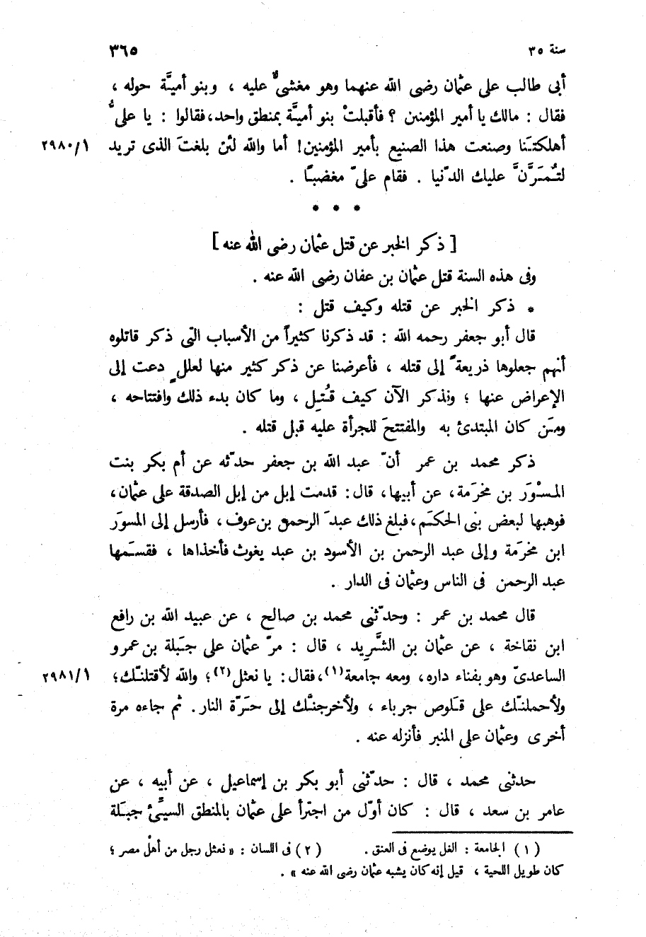 وَفِي هَذِهِ السَّنَةِ قُتِلَ عُثْمَانُ بْن عَفَّانَ رَضِيَ اللَّه عَنْهُ.
