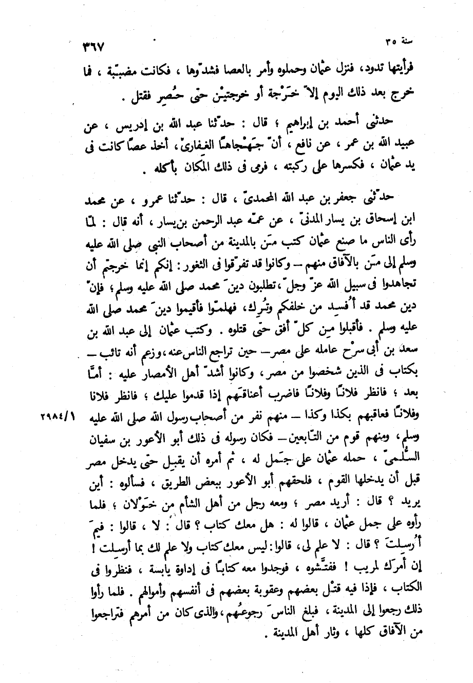 حَدَّثَنِي أَحْمَدُ بْنُ إِبْرَاهِيمَ، قَالَ: حَدَّثَنَا عَبْدُ اللَّهِ بْنُ ادريس، عَنْ عُبَيْدِ اللَّهِ بْنِ عُمَرَ، عَنْ نَافِعٍ، أن جهجاها الْغِفَارِيّ، أخذ عصا كَانَتْ فِي يد عُثْمَان، فكسرها عَلَى ركبته، فرمي فِي ذَلِكَ المكان بأكلة حَدَّثَنِي جَعْفَرُ بْنُ عَبْدِ اللَّهِ الْمُحَمَّدِيّ، قَالَ: حَدَّثَنَا عَمْرو، عن مُحَمَّد ابن إِسْحَاق بن يسار المدني، عن عمه عبد الرَّحْمَن بن يسار، أنه قَالَ: لما رَأَى الناس مَا صنع عُثْمَان كتب من بِالْمَدِينَةِ من اصحاب النبي ص إِلَى من بالآفاق مِنْهُمْ- وكانوا قَدْ تفرقوا فِي الثغور: إنكم إنما خرجتم أن تجاهدوا فِي سبيل اللَّه عَزَّ وَجَلَّ، تطلبون دين محمد ص، فإن دين مُحَمَّد قَدْ أفسد من خلفكم وترك، فهلموا فأقيموا دين مُحَمَّد صَلَّى اللَّهُ عَلَيْهِ وَسَلَّمَ فأقبلوا من كل أفق حَتَّى قتلوه وكتب عُثْمَان إِلَى عَبْد اللَّهِ بن سَعْدِ بْنِ أبي سرح عامله عَلَى مصر- حين تراجع الناس عنه، وزعم أنه تائب- بكتاب فِي الَّذِينَ شخصوا من مصر، وكانوا أشد أهل الأمصار عَلَيْهِ: أَمَّا بَعْدُ، فانظر فلانا وفلانا فاضرب أعناقهم إذا قدموا عَلَيْك، فانظر فلانا وفلانا فعاقبهم بكذا وكذا- مِنْهُمْ نَفَرٌ مِنْ أَصْحَابِ رَسُولِ اللَّهِ صَلَّى اللَّهُ عَلَيْهِ وَسَلَّمَ، ومنهم قوم من التابعين- فكان رسوله فِي ذَلِكَ أَبُو الأعور بن سُفْيَان السلمي، حمله عُثْمَان عَلَى جمل لَهُ، ثُمَّ أمره أن يقبل حَتَّى يدخل مصر قبل أن يدخلها القوم، فلحقهم أَبُو الأعور ببعض الطريق، فسألوه: أين يريد؟ قَالَ: أريد مصر، وَمَعَهُ رجل من أهل الشام من خولان، فلما رأوه عَلَى جمل عُثْمَان، قَالُوا لَهُ: هل معك كتاب؟ قَالَ: لا، قَالُوا: فيم أرسلت؟ قَالَ: لا علم لي، قَالُوا: ليس معك كتاب وَلا علم لك بِمَا أرسلت! إن أمرك لمريب! ففتشوه، فوجدوا مَعَهُ كتابا فِي إداوة يابسة، فنظروا فِي الكتاب، فإذا فِيهِ قتل بعضهم وعقوبة بعضهم فِي أنفسهم وأموالهم فلما رأوا ذَلِكَ رجعوا إِلَى الْمَدِينَةِ، فبلغ الناس رجوعهم، والذي كَانَ من أمرهم فتراجعوا من الآفاق كلها، وثار أهل الْمَدِينَةِ