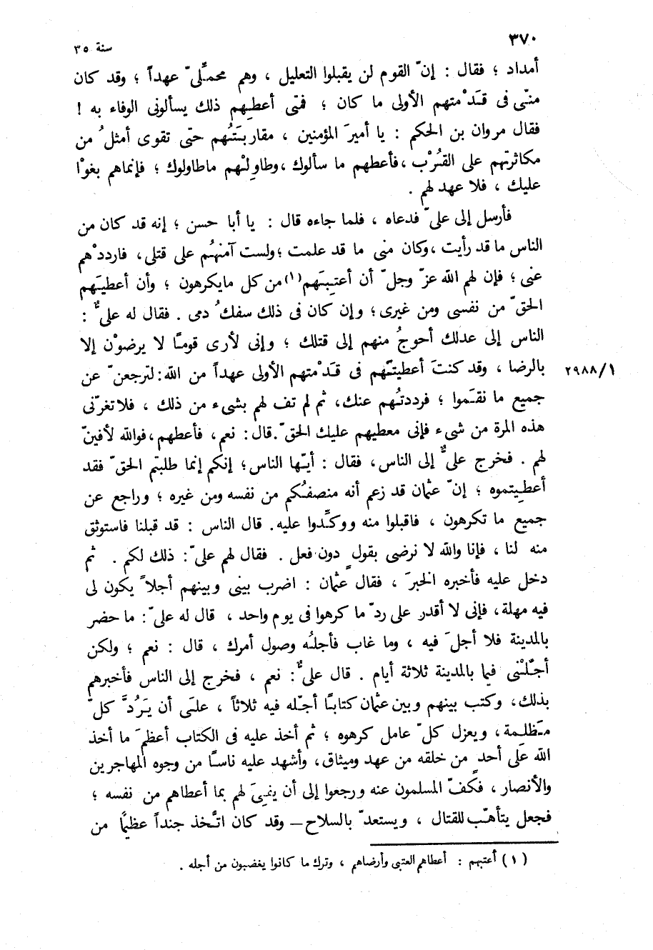 الناس إِلَى عدلك أحوج مِنْهُمْ إِلَى قتلك، وإني لأرى قوما لا يرضون إلا بالرضا، وَقَدْ كنت أعطيتهم فِي قدمتهم الأولى عهدا من اللَّه: لترجعن عن جميع مَا نقموا، فرددتهم عنك، ثُمَّ لم تف لَهُمْ بشيء من ذَلِكَ، فلا تغرني هَذِهِ المرة من شَيْء فإني معطيهم عَلَيْك الحق] قال: نعم، فأعطهم، فو الله لأفين لَهُمْ [فخرج علي إِلَى النَّاسِ، فَقَالَ: أَيُّهَا النَّاسُ، إنكم إنما طلبتم الحق فقد أعطيتموه، إن عُثْمَان قَدْ زعم أنه منصفكم من نفسه ومن غيره، وراجع عن جميع مَا تكرهون، فاقبلوا مِنْهُ ووكدوا عَلَيْهِ قَالَ الناس: قَدْ قبلنا فاستوثق مِنْهُ لنا، فإنا وَاللَّهِ لا نرضى بقول دون فعل] فَقَالَ لَهُمْ علي: ذَلِكَ لكم ثُمَّ دخل عَلَيْهِ فأخبره الخبر، فَقَالَ عُثْمَان: اضرب بيني وبينهم أجلا يكون لي فِيهِ مهلة، فإني لا أقدر عَلَى رد مَا كرهوا فِي يوم واحد، قَالَ لَهُ علي: مَا حضر بِالْمَدِينَةِ فلا أجل فِيهِ، وما غاب فأجله وصول أمرك، قَالَ: نعم، ولكن أجلني فِيمَا بِالْمَدِينَةِ ثلاثة أيام قَالَ علي: نعم، فخرج إِلَى النَّاسِ فأخبرهم بِذَلِكَ، وكتب بينهم وبين عُثْمَان كتابا أجله فِيهِ ثلاثا، عَلَى أن يرد كل مظلمة، ويعزل كل عامل كرهوه، ثُمَّ أخذ عَلَيْهِ فِي الكتاب أعظم مَا أخذ اللَّه عَلَى أحد من خلقه من عهد وميثاق، وأشهد عَلَيْهِ ناسا من وجوه الْمُهَاجِرِينَ والأنصار، فكف الْمُسْلِمُونَ عنه ورجعوا إِلَى أن يفي لَهُمْ بِمَا أعطاهم من نفسه، فجعل يتأهب للقتال، ويستعد بالسلاح- وَقَدْ كَانَ اتخذ جندا عظيما من