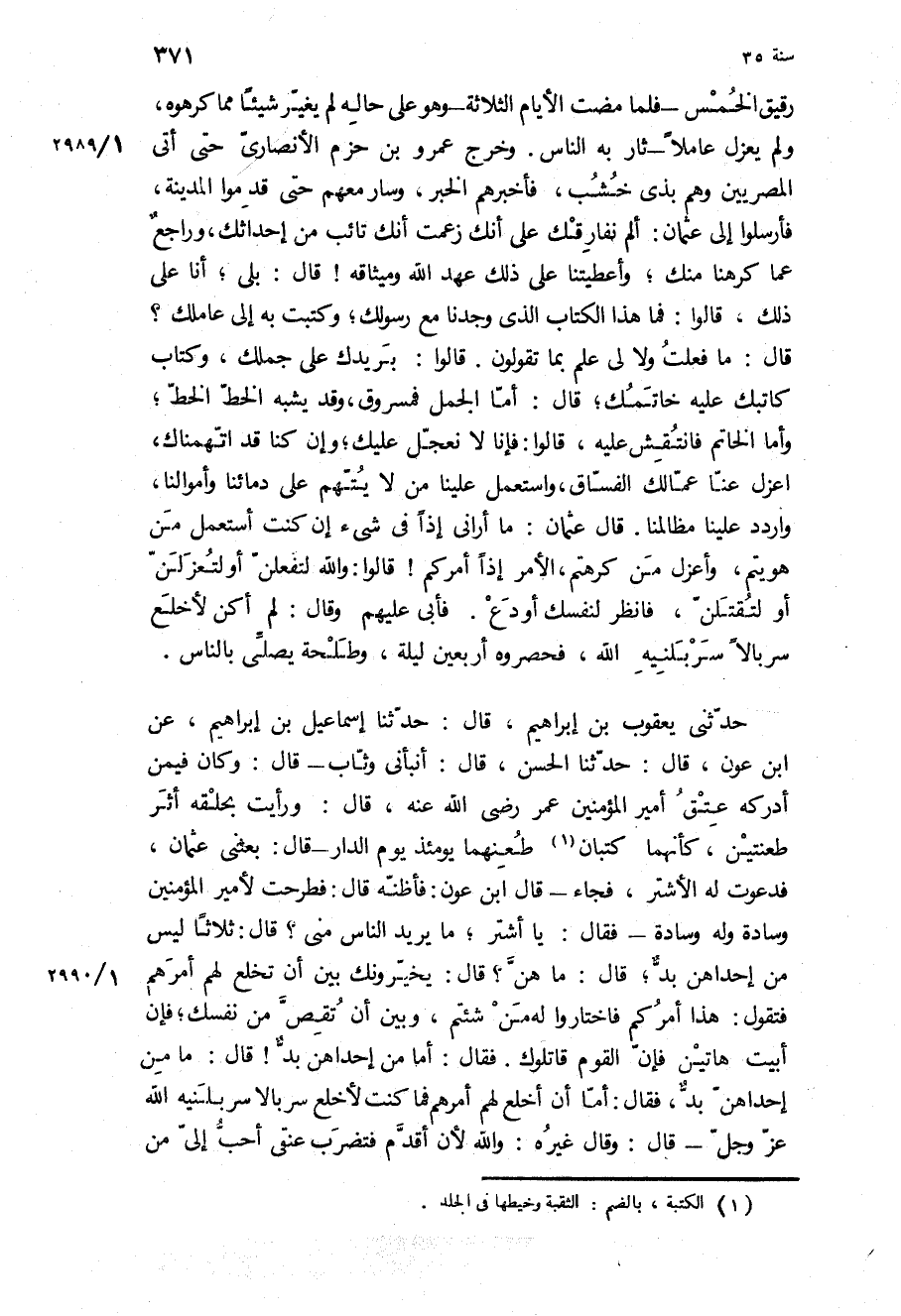 رقيق الخمس- فلما مضت الأيام الثلاثة- وَهُوَ عَلَى حاله لم يغير شَيْئًا مما كرهوه، ولم يعزل عاملا- ثار بِهِ الناس وخرج عَمْرو بن حزم الأَنْصَارِيّ حَتَّى أتى المصريين وهم بذي خشب، فأخبرهم الخبر، وسار معهم حَتَّى قدموا الْمَدِينَةَ، فأرسلوا إِلَى عُثْمَانَ: ألم نفارقك عَلَى أنك زعمت أنك تائب من أحداثك، وراجع عما كرهنا مِنْكَ، وأعطيتنا عَلَى ذَلِكَ عهد اللَّه وميثاقه! قَالَ: بلى، أنا عَلَى ذَلِكَ، قَالُوا: فما هَذَا الكتاب الَّذِي وجدنا مع رسولك، وكتبت بِهِ إِلَى عاملك؟