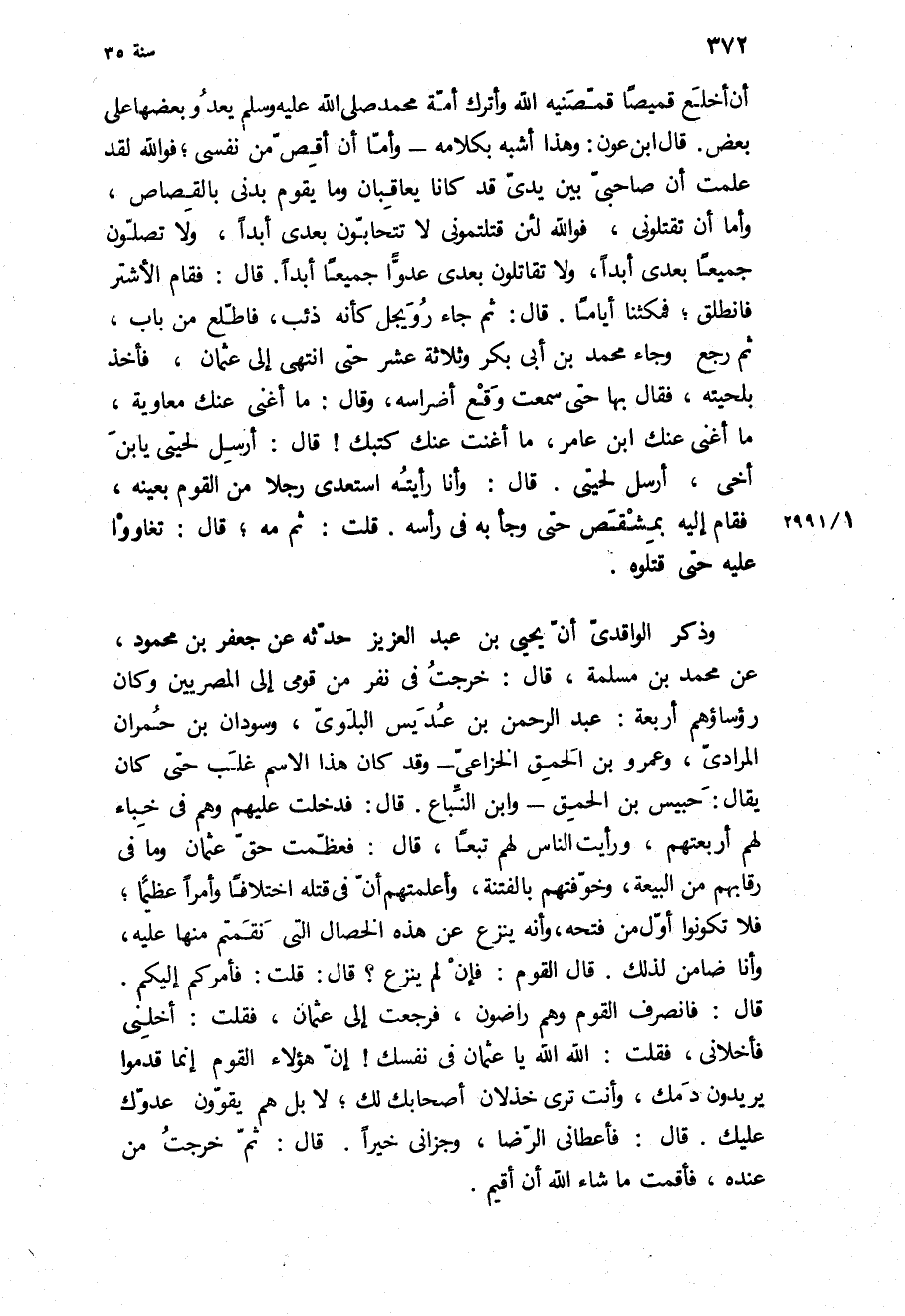 ان أخلع قميصا قمصنيه اللَّه وأترك أمة مُحَمَّد ص يعد وبعضها عَلَى بعض قَالَ ابن عون: وهذا أشبه بكلامه- واما ان أقص من نفسي، فو الله لقد علمت أن صاحبي بين يدي قَدْ كانا يعاقبان وما يقوم بدني بالقصاص، وإما ان تقتلوني، فو الله لَئِنْ قتلتموني لا تتحابون بعدي أبدا، وَلا تصلون جميعا بعدي أبدا، وَلا تقاتلون بعدي عدوا جميعا أبدا قَالَ: فقام الأَشْتَر فانطلق، فمكثنا أياما قَالَ: ثُمَّ جَاءَ رويجل كأنه ذئب، فاطلع من باب، ثُمَّ رجع وجاء مُحَمَّد بن أبي بكر وثلاثة عشر حَتَّى انتهى إِلَى عُثْمَانَ، فأخذ بلحيته، فَقَالَ بِهَا حَتَّى سمعت وقع أضراسه، وَقَالَ: مَا أغنى عنك مُعَاوِيَة، مَا أغنى عنك ابن عَامِر، مَا أغنت عنك كتبك! قَالَ: أرسل لحيتي يا بن أخي، أرسل لحيتي قَالَ: وأنا رأيته استعدى رجلا من القوم بعينه، فقام إِلَيْهِ بمشقص حَتَّى وجأ بِهِ فِي رأسه قلت: ثُمَّ مه، قَالَ: تغاووا عَلَيْهِ حَتَّى قتلوه.