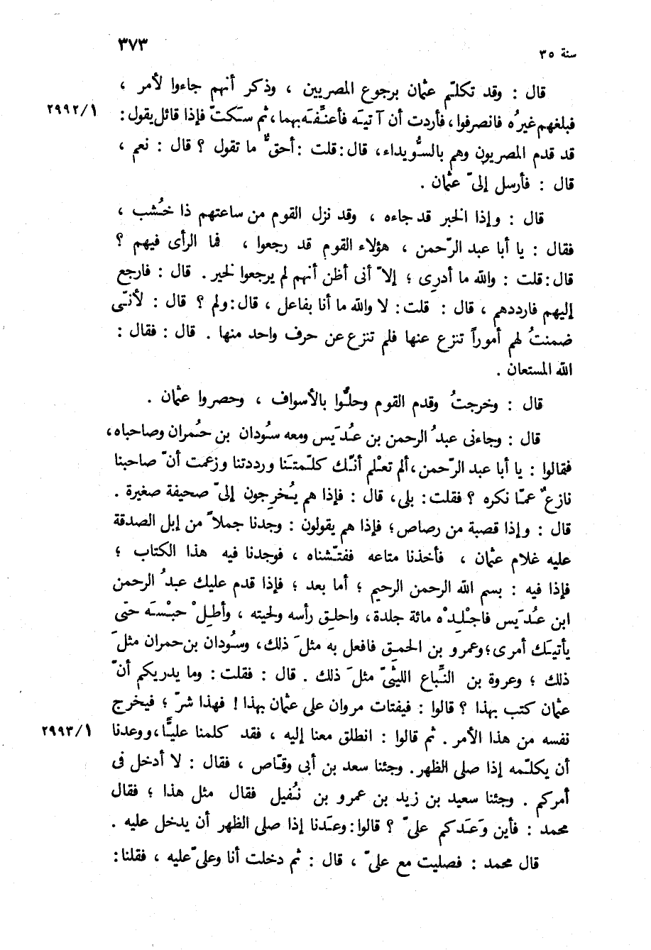 قَالَ: وإذا قصبة من رصاص، فإذا هم يقولون: وجدنا جملا من إبل الصدقة عَلَيْهِ غلام عُثْمَان، فأخذنا متاعه ففتشناه، فوجدنا فِيهِ هَذَا الكتاب، فإذا فِيهِ: بِسْمِ اللَّهِ الرَّحْمَنِ الرَّحِيمِ، أَمَّا بَعْدُ، فإذا قدم عليك عبد الرحمن ابن عديس فاجلده مائة جلدة، واحلق رأسه ولحيته، وأطل حبسه حَتَّى يأتيك أمري، وعمرو بن الحمق فافعل بِهِ مثل ذَلِكَ، وسودان بن حمران مثل ذَلِكَ، وعروة بن النباع اللَّيْثِيّ مثل ذَلِكَ قَالَ: فقلت: وما يدريكم أن عُثْمَان كتب بهذا؟ قَالُوا: فيفتات مَرْوَان عَلَى عُثْمَانَ بهذا! فهذا شر، فيخرج نفسه من هَذَا الأمر ثُمَّ قَالُوا: انطلق معنا إِلَيْهِ، فقد كلمنا عَلِيًّا، ووعدنا أن يكلمه إذا صلى الظهر وجئنا سعد بن أَبِي وَقَّاص، فَقَالَ: لا أدخل فِي أمركم وجئنا سَعِيد بن زَيْد بن عَمْرو بن نفيل فَقَالَ مثل هَذَا، فَقَالَ مُحَمَّد: فأين وعدكم علي؟ قَالُوا: وعدنا إذا صلى الظهر أن يدخل عَلَيْهِ.