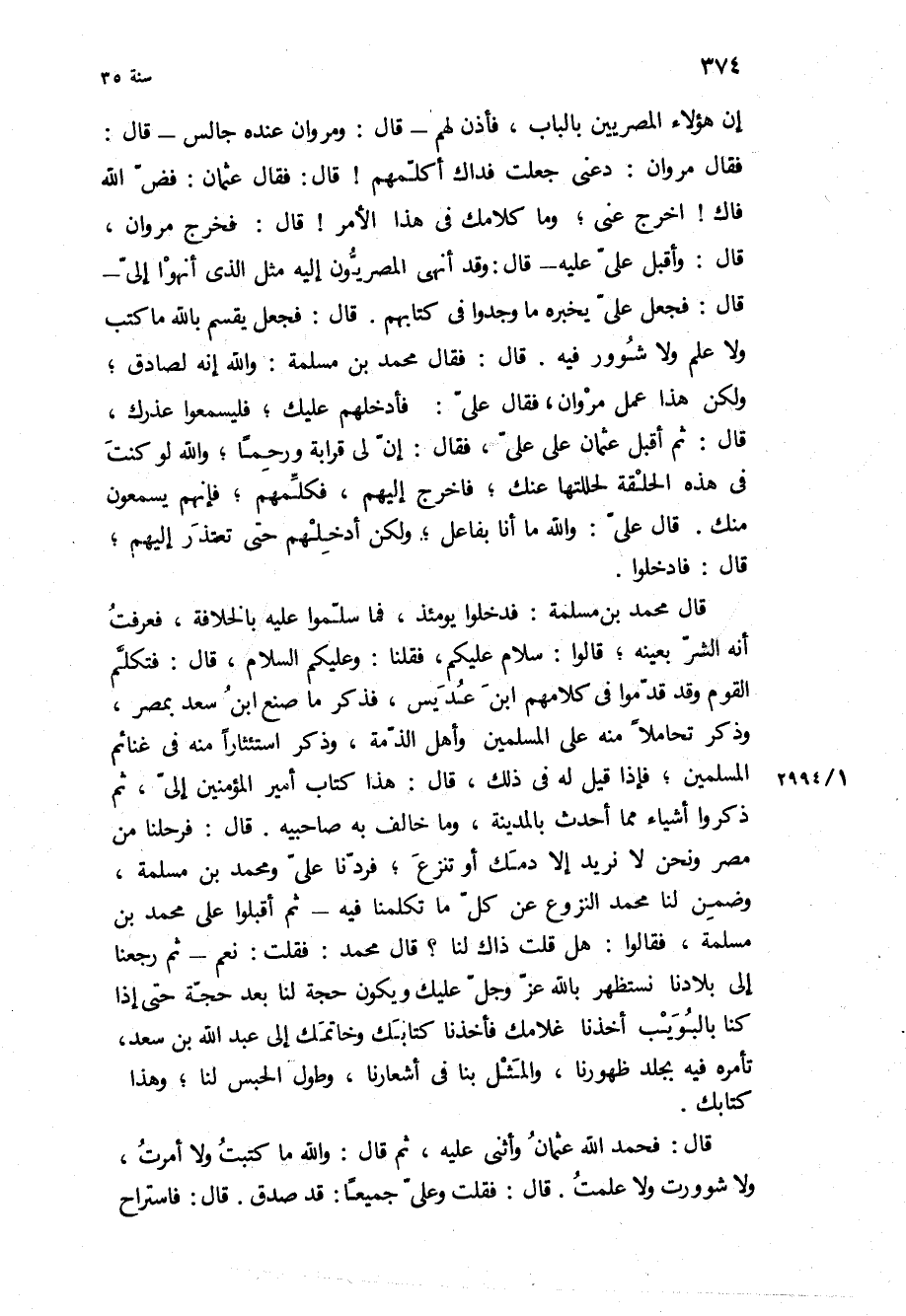 فَقَالَ مَرْوَان: دعني جعلت فداك أكلمهم! قَالَ: فَقَالَ عُثْمَان: فض اللَّه فاك! اخرج عني، وما كلامك فِي هَذَا الأمر! قَالَ: فخرج مَرْوَان، قَالَ: وأقبل علي عَلَيْهِ- قَالَ: وَقَدْ أنهى الْمِصْرِيُّونَ إِلَيْهِ مثل الَّذِي أنهوا إلي- قَالَ: فجعل علي يخبره مَا وجدوا فِي كتابهم قَالَ: فجعل يقسم بِاللَّهِ مَا كتب وَلا علم وَلا شوور فِيهِ قَالَ: فَقَالَ مُحَمَّد بن مسلمة: وَاللَّهِ إنه لصادق، ولكن هَذَا عمل مَرْوَان، فَقَالَ علي: فأدخلهم عَلَيْك، فليسمعوا عذرك، قَالَ: ثُمَّ أقبل عُثْمَان عَلَى علي، فَقَالَ: إن لي قرابة ورحما، وَاللَّهِ لو كنت فِي هَذِهِ الحلقة لحللتها عنك، فاخرج إِلَيْهِم، فكلمهم، فإنهم يسمعون مِنْكَ قَالَ علي: وَاللَّهِ مَا أنا بفاعل، ولكن أدخلهم حَتَّى تعتذر إِلَيْهِم، قَالَ: فأدخلوا.