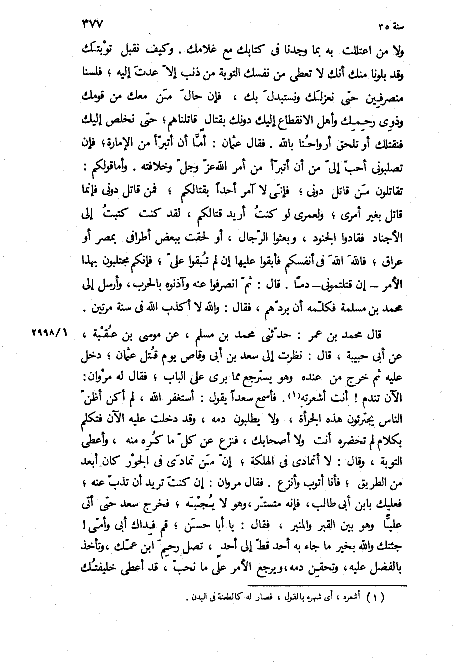 الآنَ تَنْدَمُ! أَنْتَ أَشْعَرْتَهُ فَأَسْمَعُ سَعْدًا يَقُولُ: أَسْتَغْفِرُ اللَّهَ، لَمْ أَكُنْ أَظُنُّ النَّاسَ يَجْتَرِئُونَ هَذِهِ الْجُرْأَةَ، وَلا يَطْلُبُونَ دَمَهُ، وَقَدْ دَخَلْتُ عَلَيْهِ الآنَ فَتَكَلَّمَ بِكَلامٍ لَمْ تَحْضُرْهُ أَنْتَ وَلا أَصْحَابُكَ، فَنَزَعَ عَنْ كُلِّ مَا كُرِهَ مِنْهُ، وَأَعْطَى التَّوْبَةَ، وَقَالَ: لا أَتَمَادَى فِي الْهَلَكَةِ، إِنَّ مَنْ تَمَادَى فِي الْجَوْرِ كَانَ أَبْعَدَ مِنَ الطَّرِيقِ، فَأَنَا أَتُوبُ وَأَنْزِعُ فَقَالَ مَرْوَانُ: إِنْ كُنْتَ تُرِيدُ أَنْ تَذُبَّ عَنْهُ، فَعَلَيْكَ بِابْنِ أَبِي طَالِبٍ، فَإِنَّهُ مُتَسَتِّرٌ، وَهُوَ لا يُجِبْهُ، فَخَرَجَ سَعْدٌ حَتَّى أَتَى عَلِيًّا وَهُوَ بَيْنَ الْقَبْرِ وَالْمِنْبَرِ، فَقَالَ: يَا أَبَا حَسَنٍ، قُمْ فِدَاكَ أَبِي وَأُمِّي! جِئْتُكَ وَاللَّهِ بِخَيْرِ مَا جَاءَ بِهِ أَحَدٌ قَطُّ إِلَى أَحَدٍ، تَصِلُ رَحِمَ ابْنِ عَمِّكَ، وَتَأْخُذُ بِالْفَضْلِ عَلَيْهِ، وَتَحْقِنُ دَمَهُ، وَيَرْجِعُ الأَمْرُ عَلَى مَا نُحِبُّ، قَدْ أَعْطَى خليفتك
