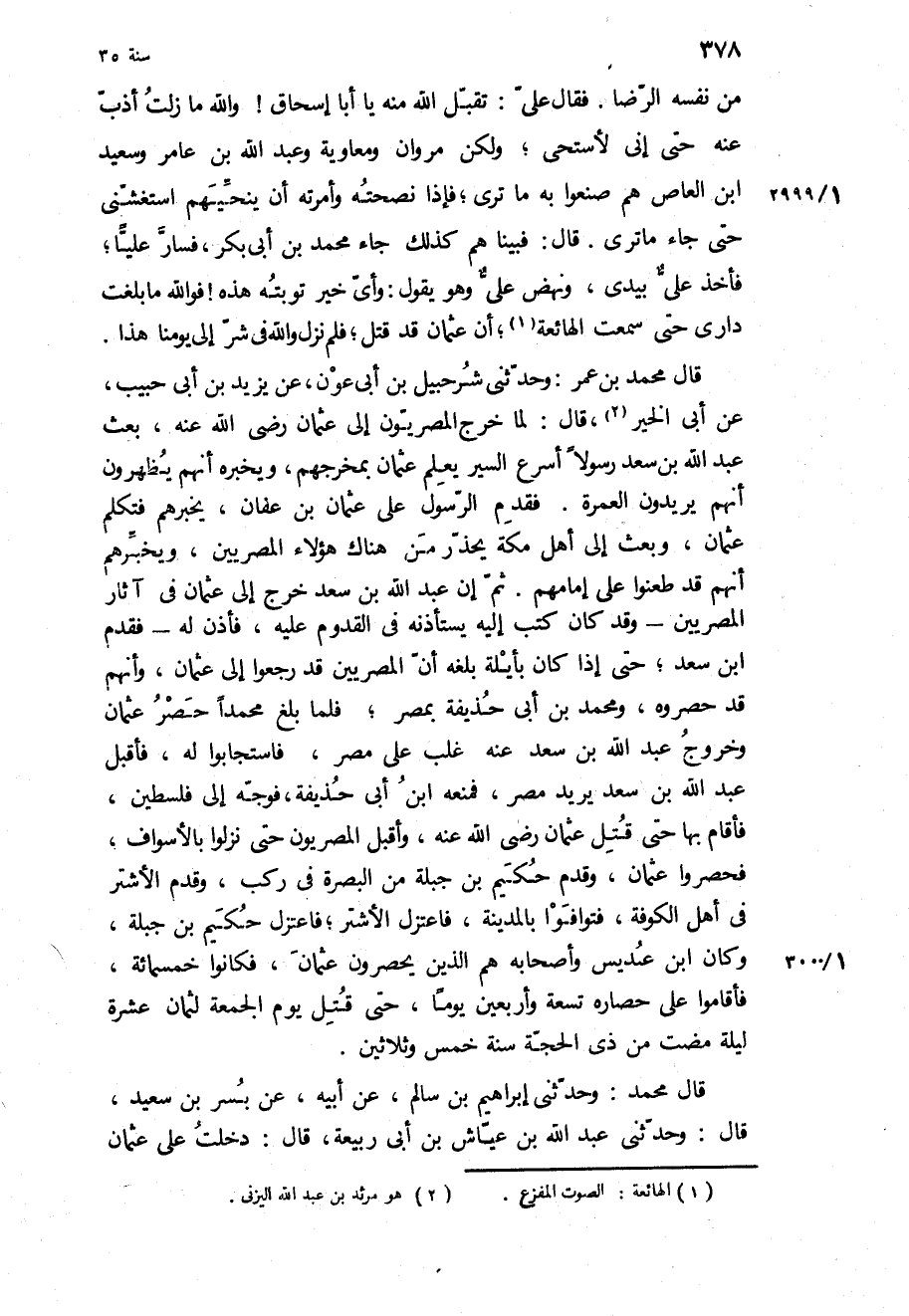 مِنْ نَفْسِهِ الرِّضَا [فَقَالَ عَلِيٌّ: تَقَبَّلَ اللَّهُ مِنْهُ يَا أَبَا إِسْحَاقَ! وَاللَّهِ مَا زِلْتُ أَذُبُّ عَنْهُ حَتَّى إِنِّي لأَسْتَحِي، وَلَكِنَّ مَرْوَانَ ومعاويه وعبد الله بن عامر وسعيد ابن الْعَاصِ هُمْ صَنَعُوا بِهِ مَا تَرَى، فَإِذَا نَصَحْتُهُ وَأَمَرْتُهُ أَنْ يُنَحِّيهِمْ استغشني حَتَّى جَاءَ مَا تَرَى] قَالَ: فَبَيْنَا هُمْ كَذَلِكَ جَاءَ مُحَمَّدُ بْنُ أَبِي بَكْرٍ، فَسَارَّ عَلِيًّا، فَأَخَذَ عَلِيٌّ بِيَدِي، وَنَهَضَ عَلِيٌ وَهُوَ يَقُولُ: وَأَيُّ خير توبته هذه! فو الله مَا بَلَغْتُ دَارِي حَتَّى سَمِعْتُ الْهَائِعَةَ، أَنَّ عُثْمَانَ قَدْ قُتِلَ، فَلَمْ نَزَلْ وَاللَّهِ فِي شَرٍّ إِلَى يَوْمِنَا هَذَا.