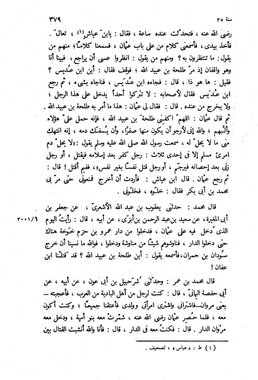 ثُمَّ قَالَ عُثْمَانُ: اللَّهُمَّ اكْفِنِي طَلْحَةَ بْنَ عُبَيْدِ اللَّهِ، فَإِنَّهُ حَمَلَ عَلَيَّ هَؤُلاءِ وَأَلَّبَهُمْ، وَاللَّهِ إِنِّي لأَرْجُو أَنْ يَكُونَ مِنْهَا صِفْرًا، وَأَنْ يُسْفَكَ دَمُهُ، إِنَّهُ انْتَهَكَ مِنِّي مَا لا يَحِلُّ لَهُ، [سَمِعْتُ رَسُولَ الله ص يَقُولُ: لا يَحِلُّ دَمُ امْرِئٍ مُسْلِمٍ إِلا فِي إِحْدَى ثَلاثٍ: رَجُلٍ كَفَرَ بَعْدَ إِسْلامِهِ فَيُقْتَلُ، أَوْ رَجُلٍ زَنَى بَعْدَ إِحْصَانِهِ فَيُرْجَمُ، أَوْ رَجُلٍ قَتَلَ نَفْسًا بِغَيْرِ نَفْسٍ،] فَفِيمَ أُقْتَلُ! قَالَ: