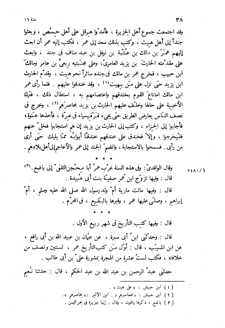 قال: وحدثني ابن أبي سبرة، عَنْ عُثْمَانَ بْنِ عُبَيْدِ اللَّهِ بْنِ أَبِي رافع، عن ابن المسيب، قال: أول من كتب التأريخ عمر، لسنتين ونصف من خلافته، فكتب لست عشرة من الهجرة بمشورة علي بْن أبي طالب.