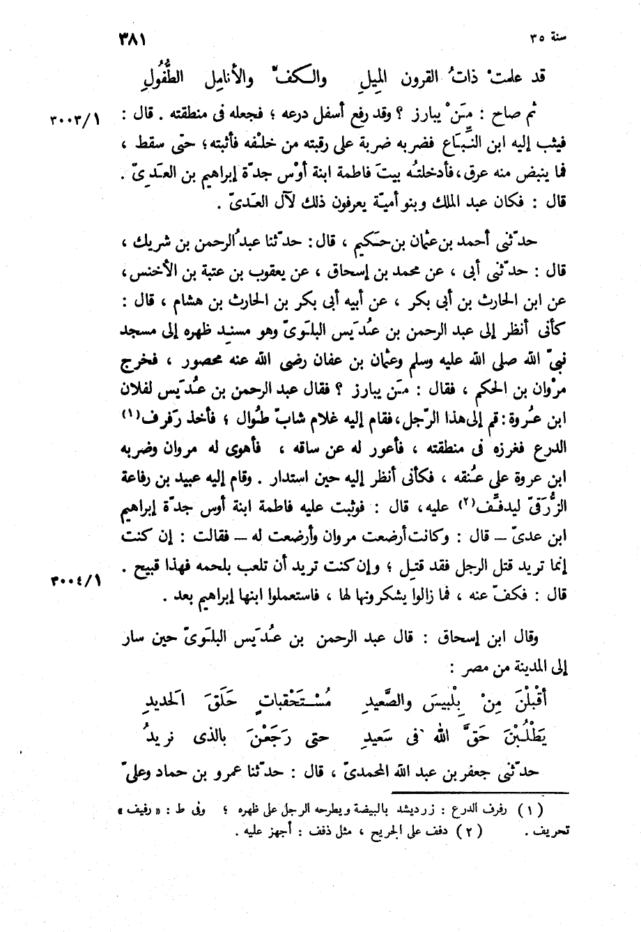 كأني أنظر إِلَى عبد الرَّحْمَن بن عديس البلوي وَهُوَ مسند ظهره الى مسجد نبى الله ص وعثمان بن عَفَّانَ رَضِيَ اللَّهُ عَنْهُ محصور، فخرج مَرْوَان بن الحكم، فَقَالَ: من يبارز؟ فقال عبد الرحمن بن عديس لفلان ابن عروة: قم إِلَى هَذَا الرجل، فقام إِلَيْهِ غلام شاب طوال، فأخذ رفرف الدرع فغرزه في منطقته، فاعور لَهُ عن ساقه، فأهوى لَهُ مَرْوَان وضربه ابن عروة عَلَى عنقه، فكأني أنظر إِلَيْهِ حين استدار وقام إِلَيْهِ عبيد بن رفاعة الزرقي ليدفف عَلَيْهِ، قَالَ: فوثبت عَلَيْهِ فاطمة ابنه أوس جده ابراهيم ابن عدي- قَالَ: وكانت أرضعت مَرْوَان وأرضعت لَهُ- فَقَالَتْ: إن كنت إنما تريد قتل الرجل فقد قتل، وإن كنت تريد أن تلعب بلحمه فهذا قبيح.